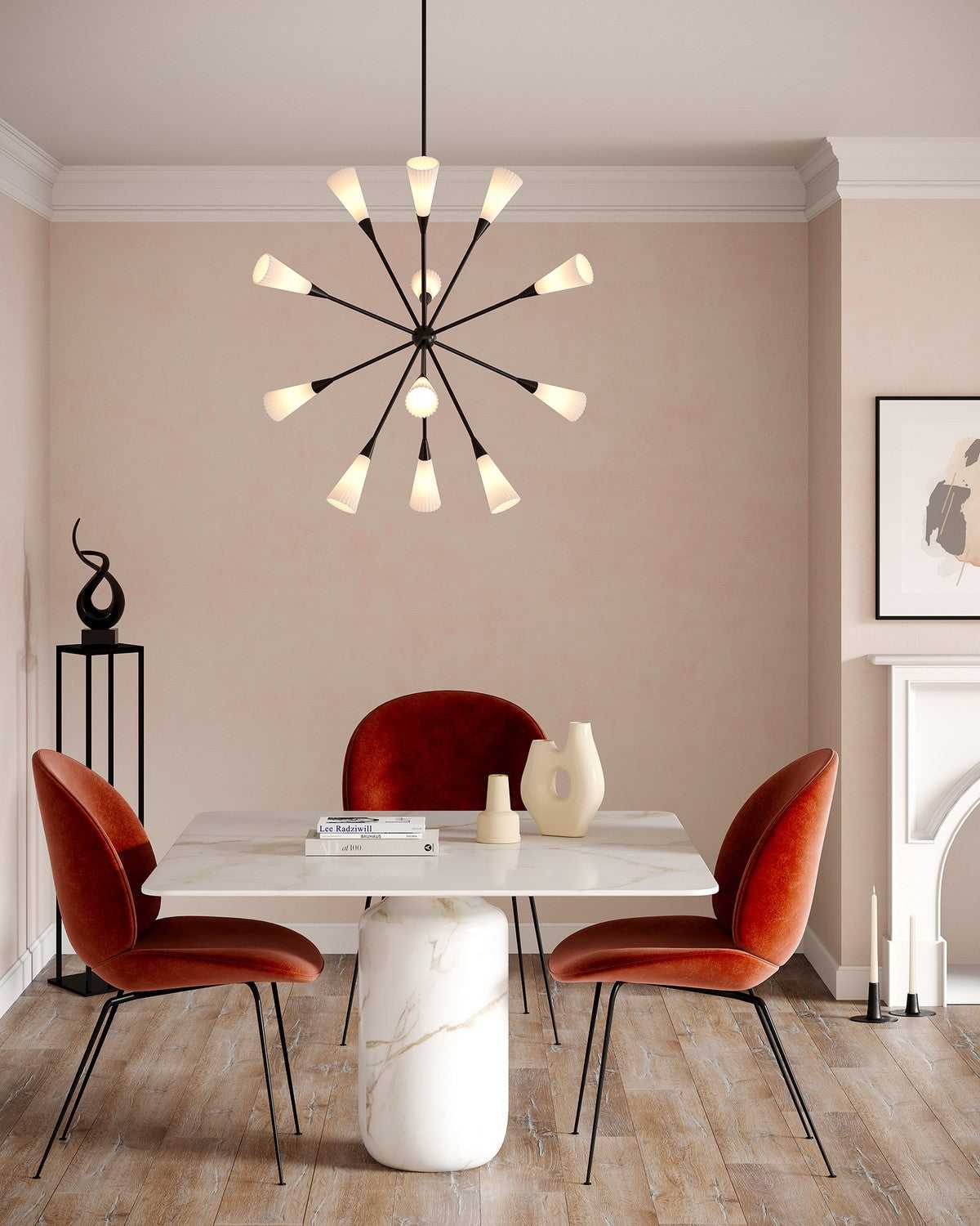 Transform your space with the Cosmo lighting collection—a modern take on the timeless mid-century sputnik chandelier. Featuring opal ribbed glass shades, Cosmo adds a touch of sleek sophistication and a bold, contemporary feel to any room's vibe.