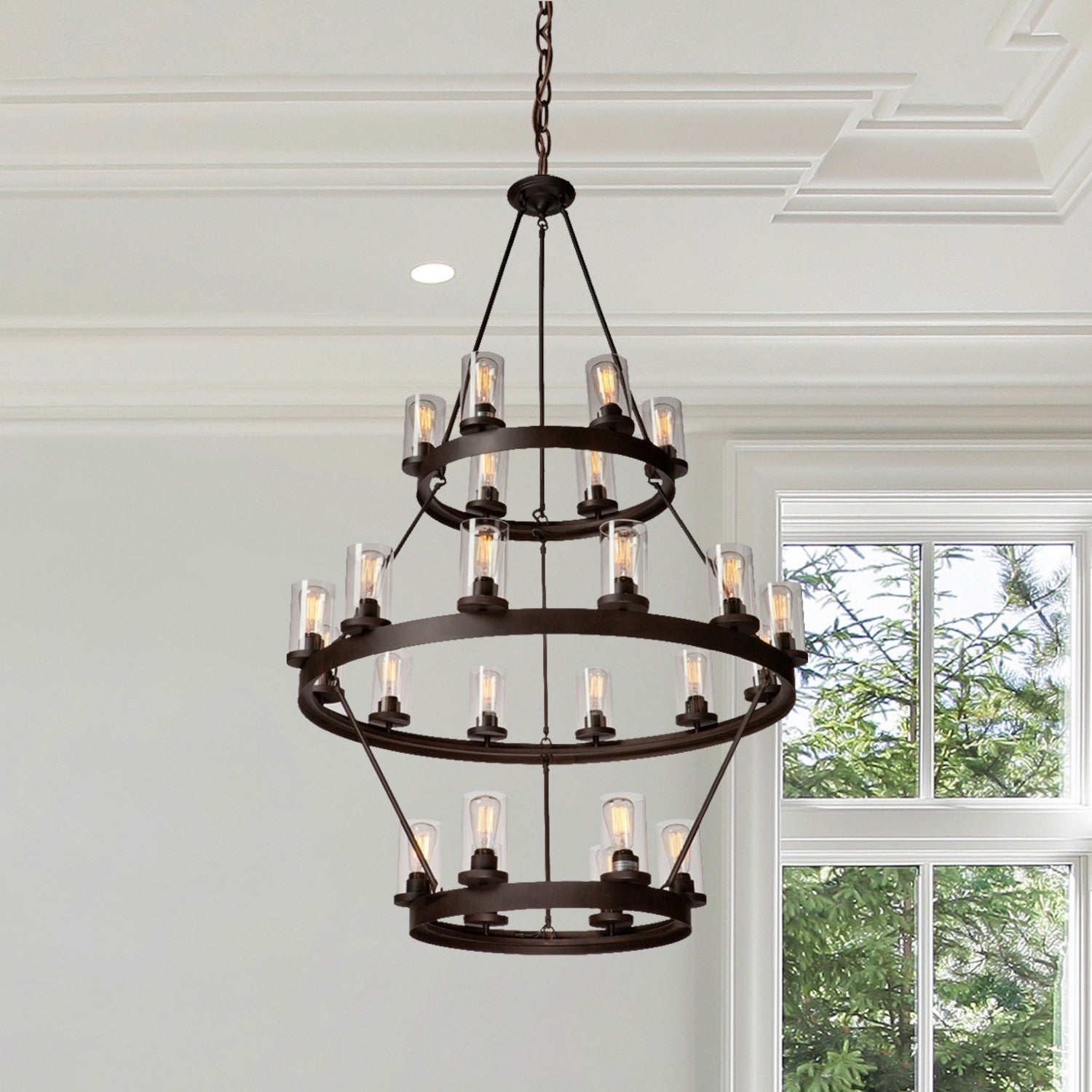 The Menlo Park Collection is painted in a dark chocolate finish, and complimented with a clear cylinder glass. Spherical clean lines throughout gives this collection the status of an instant classic. Shown with Edison filament bulbs to convey the retro look. 24 Light Foyer Chandelier