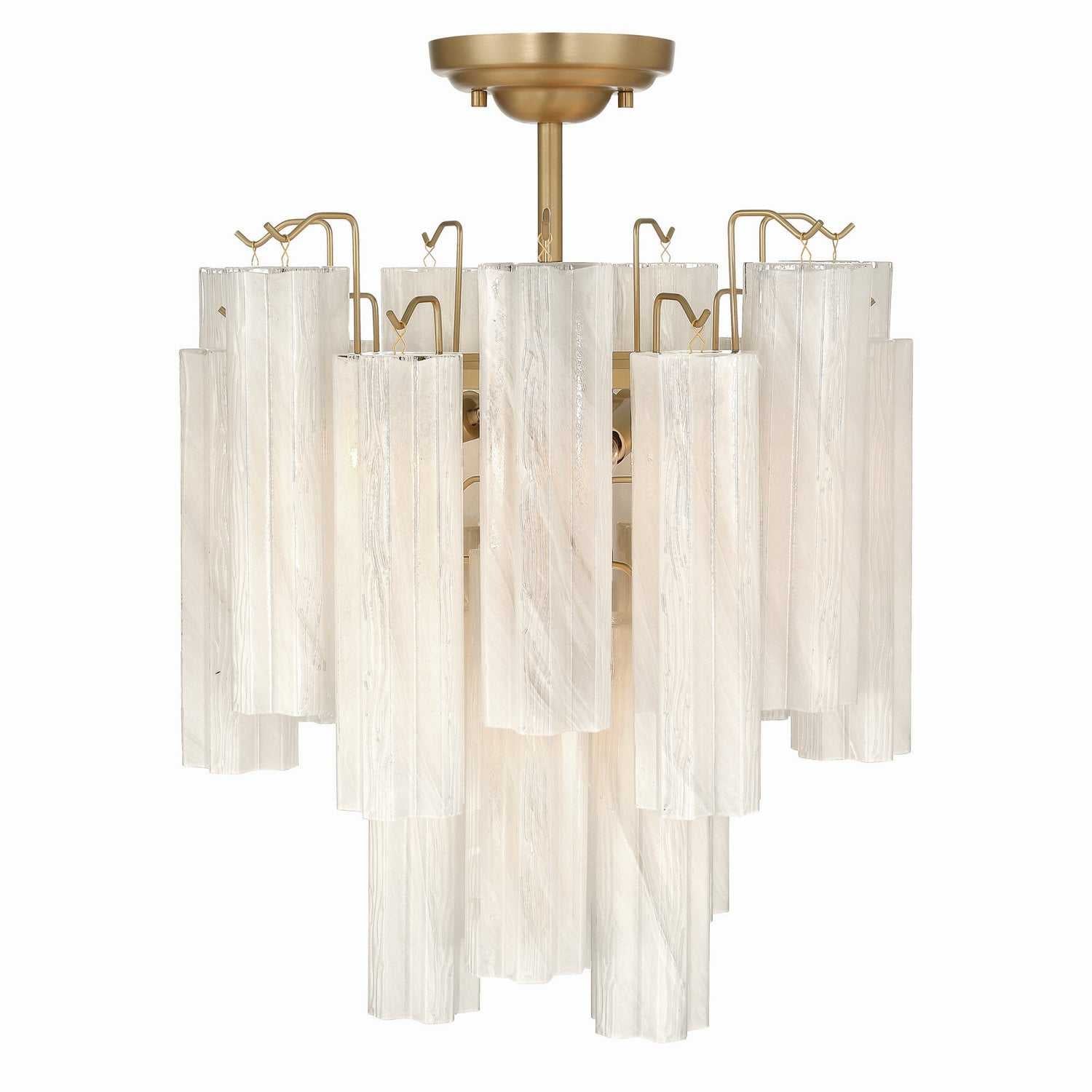 The semi flushmount from the Sophia collection captivates with its cascading arrangement of ornate "Tronchi" style Wispy White glassware, reminiscent of shimmering icicles. Each glass element delicately refracts light, creating an enchanting glow, while the warm brass frame provides a refined contrast, evoking a sense of luxury. Perfect for classic and modern interiors alike, this design transforms any space into a haven of timeless beauty.