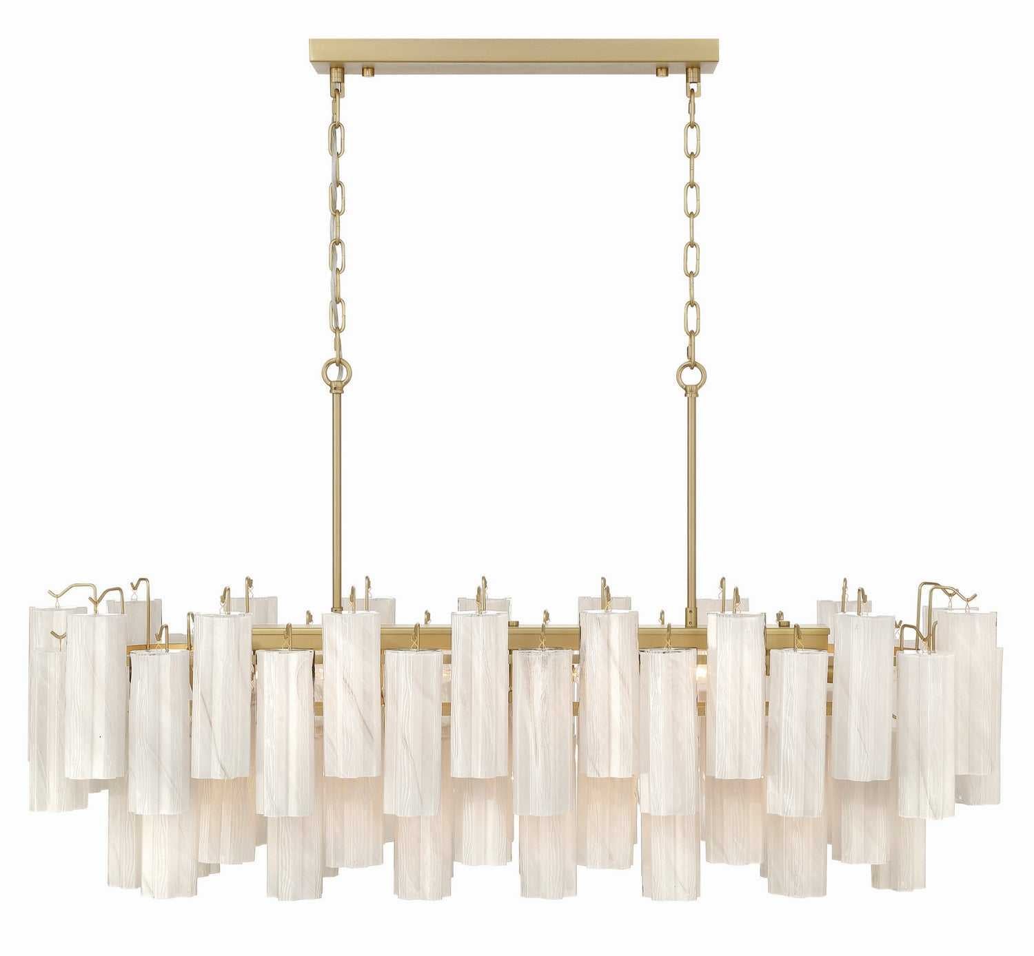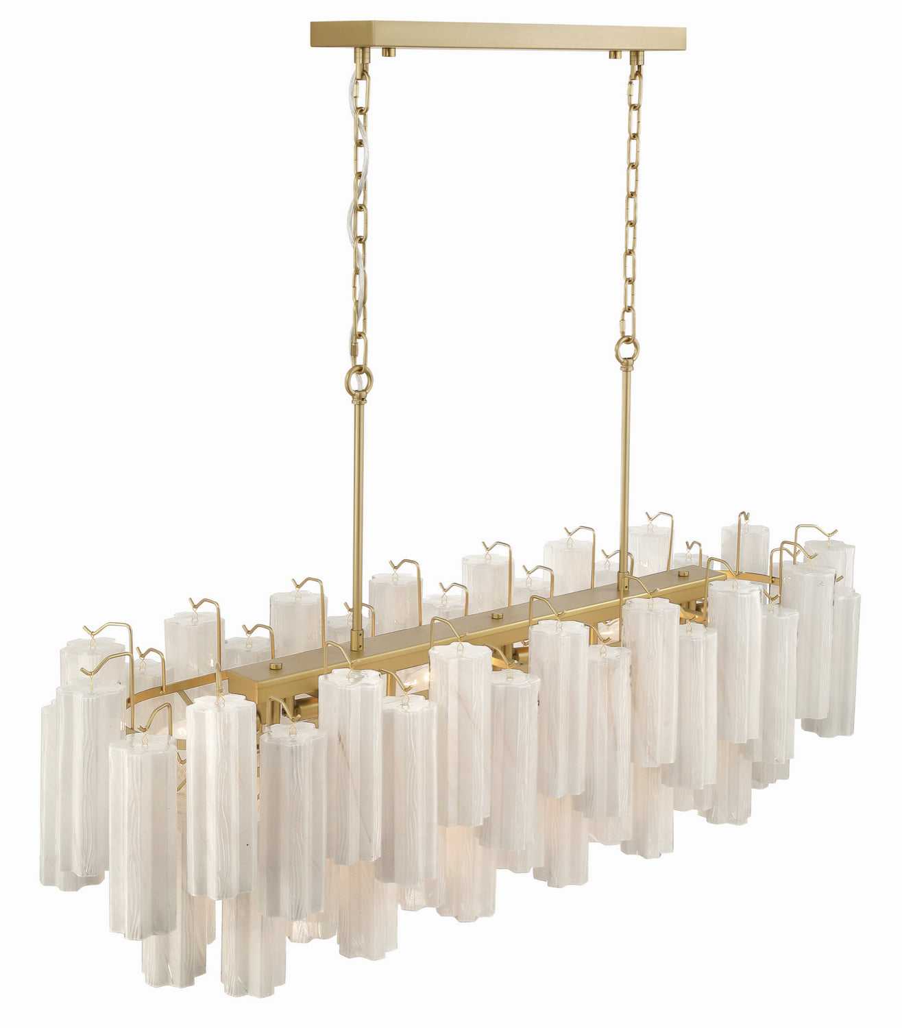 The linear island chandelier from the Sophia collection captivates with its cascading arrangement of ornate "Tronchi" style Wispy White glassware, reminiscent of shimmering icicles. Each glass element delicately refracts light, creating an enchanting glow, while the warm brass frame provides a refined contrast, evoking a sense of luxury. Perfect for classic and modern interiors alike, this design transforms any space into a haven of timeless beauty.