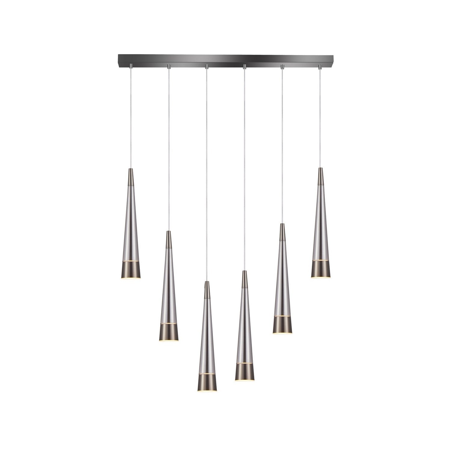 The Sunnyvale collection boasts a distinctive cone-shaped design adorned with metalwork on both the top and bottom, enveloping a captivating smoke tinted center glass complimented with pearl black framing. The pendant's exquisite craftsmanship and attention to detail result in a contemporary yet elegant aesthetic, making it a standout piece in any interior. With LED illumination seamlessly integrated throughout the glassware, the Sunnyvale collection not only delivers striking visual appeal but also provides efficient and ambient lighting. 6 light linear island chandelier model shown. (easily height adjustable)