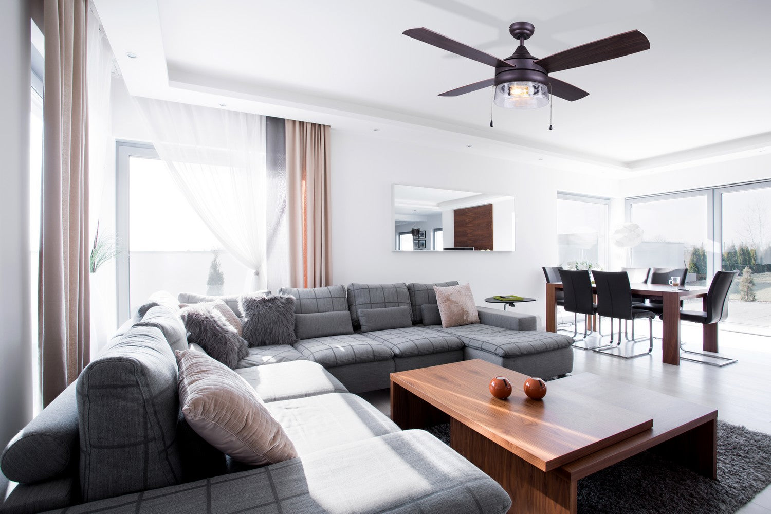 As you step into a realm where tradition meets modernity, the Mill 48 inch ceiling fan stands as a testament to this harmonious fusion. This 48-inch masterpiece, with its oil-rubbed bronze finish, evokes the nostalgia of age-old craftsmanship while embracing the essence of contemporary design. The fan's four reversible blades, dressed in walnut on one side and medium maple on the other, offer a versatile aesthetic that adapts to your mood or décor. Like a chameleon, they blend seamlessly into the fabric of your space, whether it's a rustic cabin or a sleek urban loft. At its heart, a seeded glass light fixture, reminiscent of rain-kissed mornings, cradles the included 4W LED vintage bulbs. These bulbs, not just sources of light but harbingers of ambiance, cast a warm, golden hue that bathes your room in a soft, inviting glow. The pull chains, a nod to the classic, hang with a dignified grace, offering tactile control that is both satisfying and intuitive. And with its dual mount capability, this ceiling fan can grace either a high vaulted ceiling or a more intimate lower one, making it as adaptable as it is beautiful.