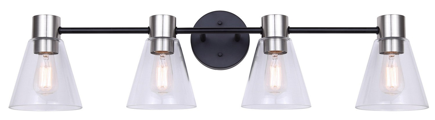 The Davina IVL1127A04BKN is a four-light vanity fixture in a striking combination of Matte Black and Brushed Nickel. It features clear glass, accommodates 60W Type A bulbs, and measures 32.5 inches wide, 8.75 inches high, and 7.5 inches deep. This vanity light is ideal for adding a contemporary flair to your bathroom.
