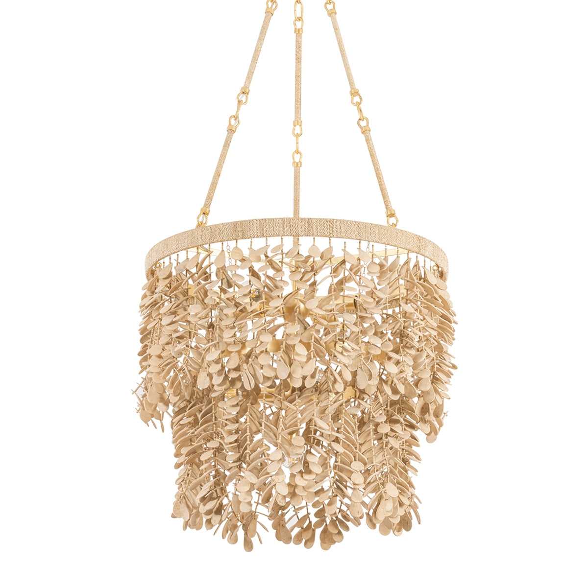 An ode to craftsmanship, the Naxos family is adorned with loosely draped strands of hand-carved coco shell pieces. The layering of smaller shell elements on each strand adds depth and volume, giving this family a sense of movement and a handcrafted beauty. Shaped like petals, the tonal pieces bring life to each design, including a 2-light wall sconce, a chandelier in three sizes, and an island light. Due to the one-of-a-kind nature of the medium, exact colors and patterns may vary slightly from the image shown.