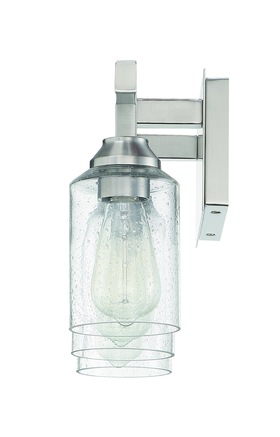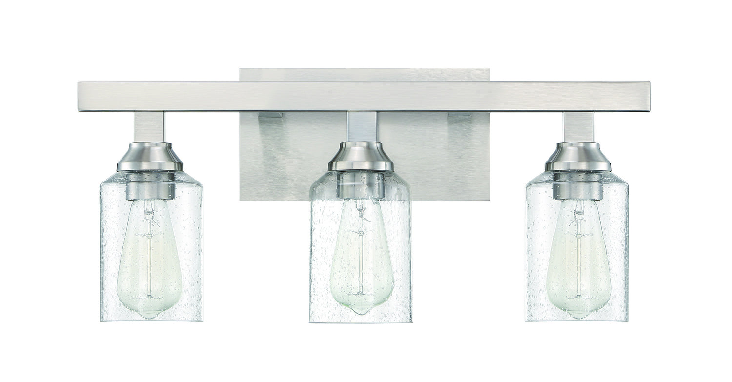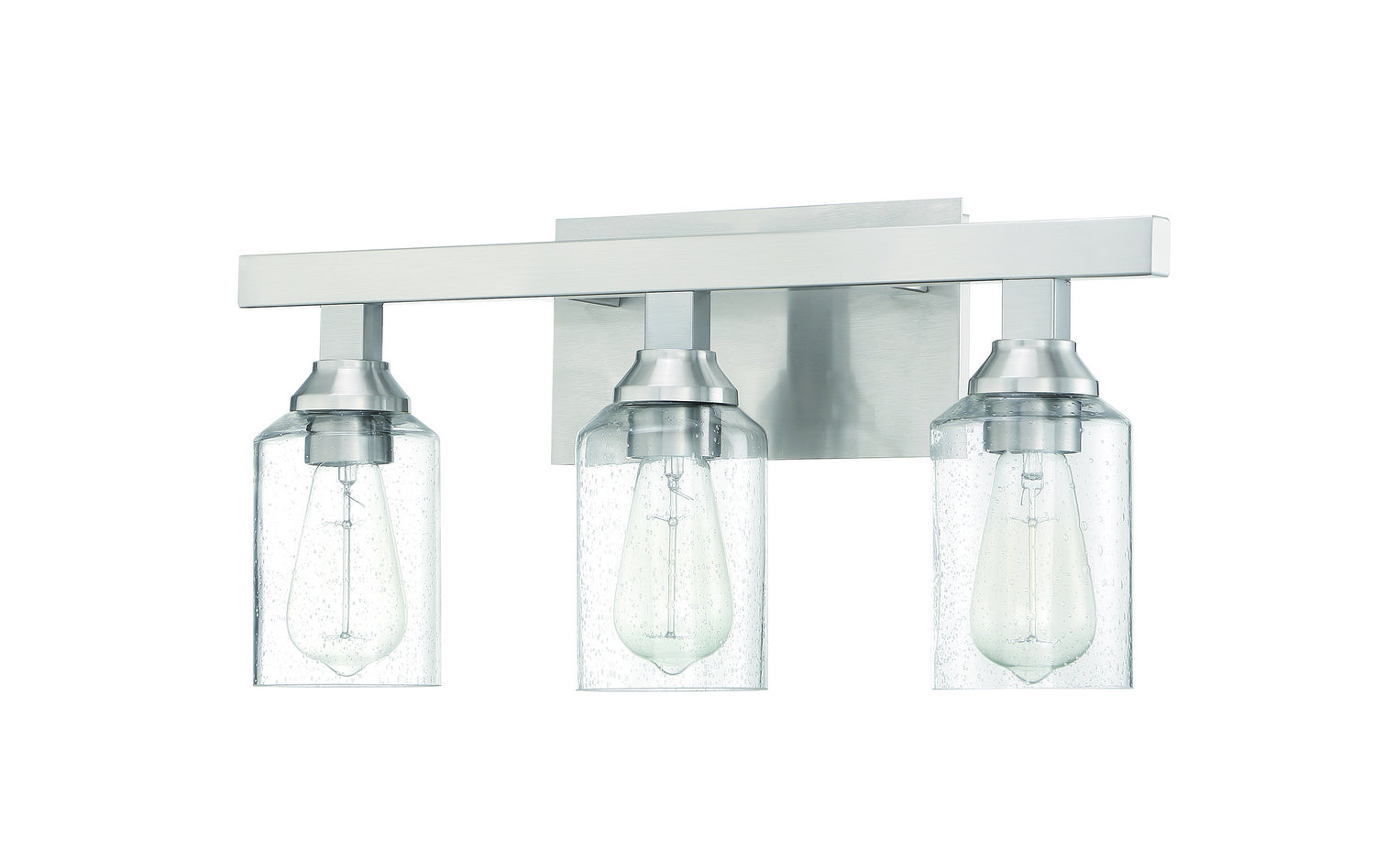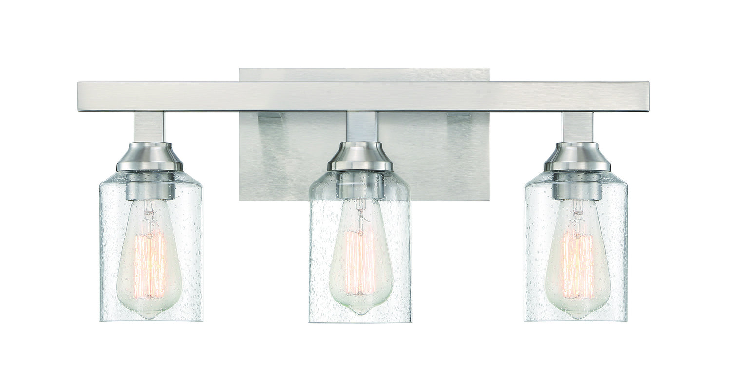 The strong lines and larger scale of the Chicago collection by Craftmade make a bold statement easily at home in any setting. The striking chandeliers do not include glass shades but can be customized with clear seeded glass globes sold separately. The coordinating clear seeded glass vanities and mini pendant provide excellent lighting options for any bathroom large or small.