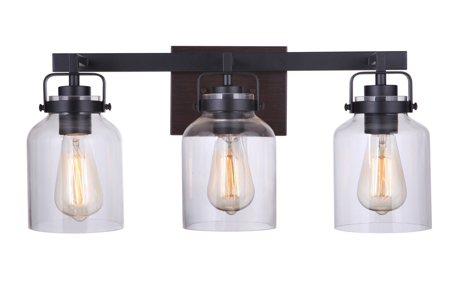 Clean lines, clear glass with a subtle nod to industrial make the Foxwood an ideal choice equally at home in a transitional or traditional setting. The flat black/dark teak finished vanities feature dark teak backplates while the hanging fixtures feature dark teak faux wood frames.