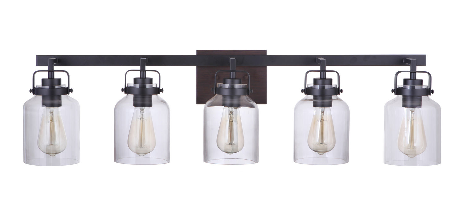Clean lines, clear glass with a subtle nod to industrial make the Foxwood an ideal choice equally at home in a transitional or traditional setting. The flat black/dark teak finished vanities feature dark teak backplates while the hanging fixtures feature dark teak faux wood frames.