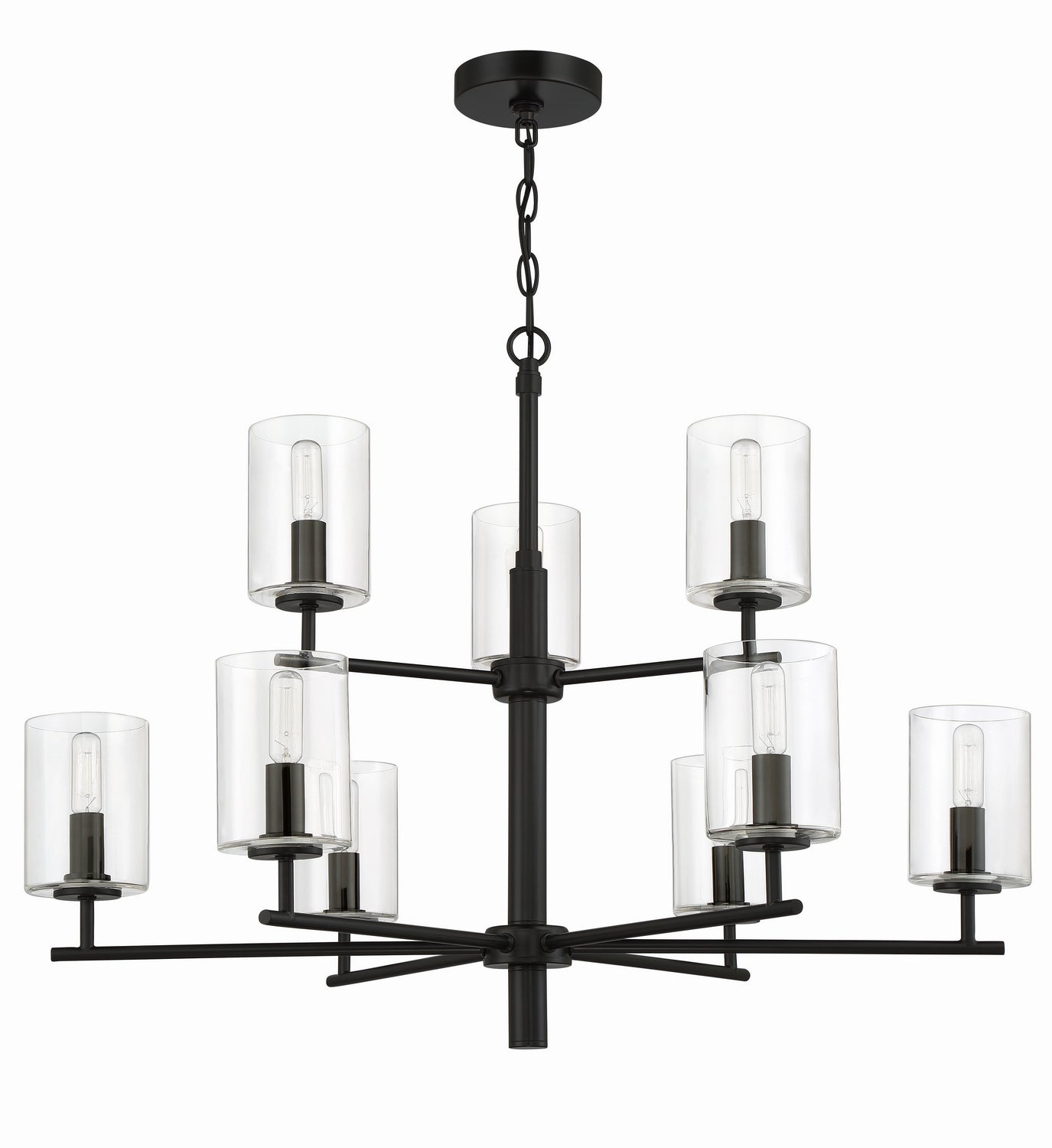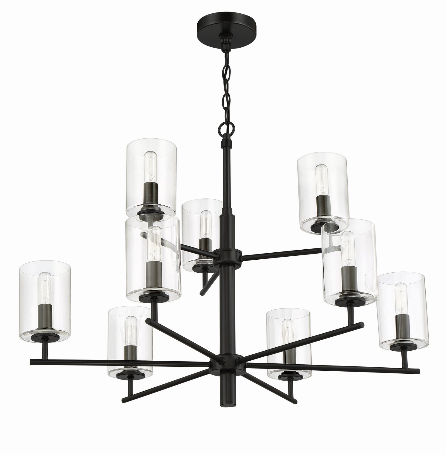 The elevated clear glass cylinder globes and slender arms enhance the simplistic beauty of the Hailie interior lighting collection by Craftmade. The Hailie collection includes a full array of chandeliers, semi and flushmounts, pendant and several sizes of vanity bath bars.