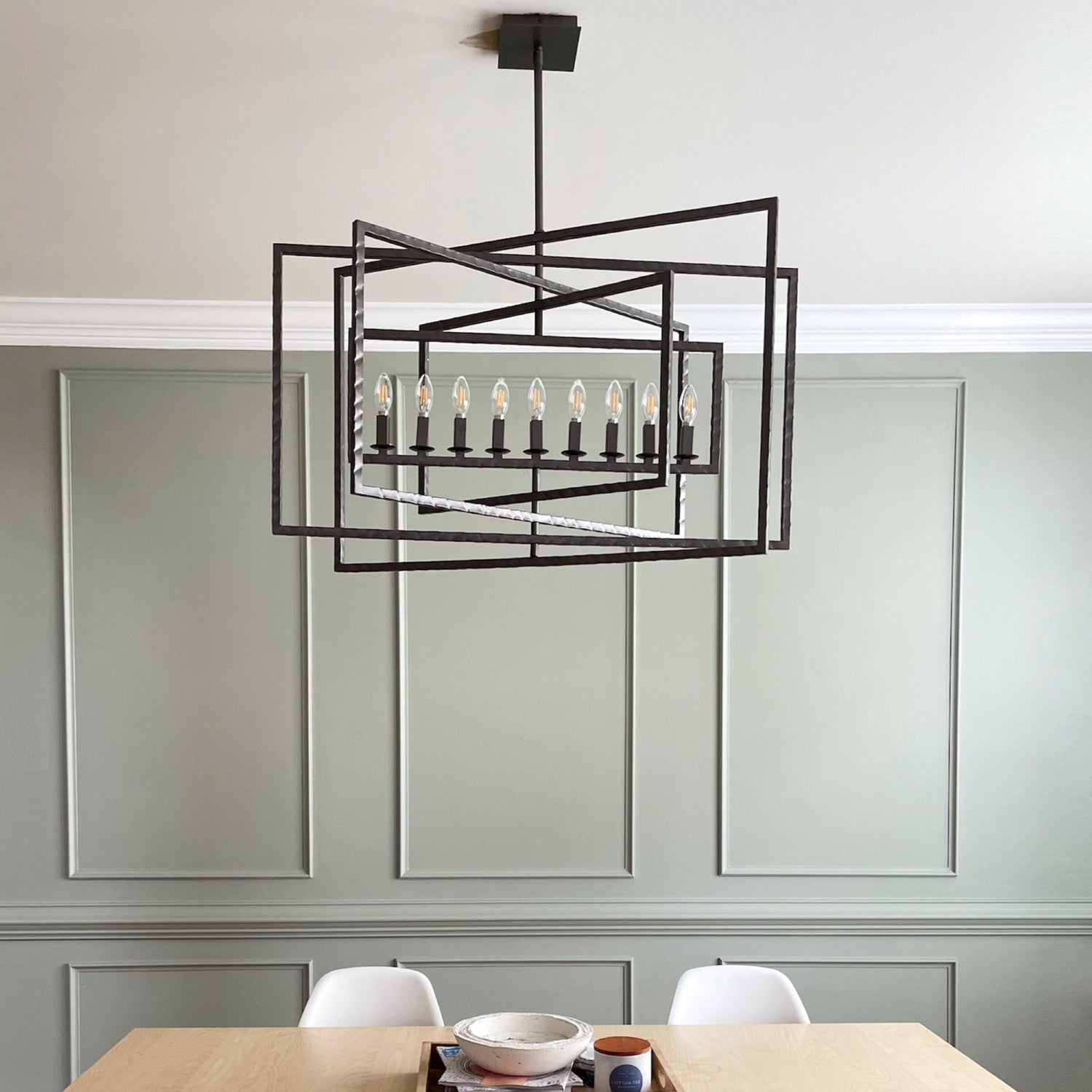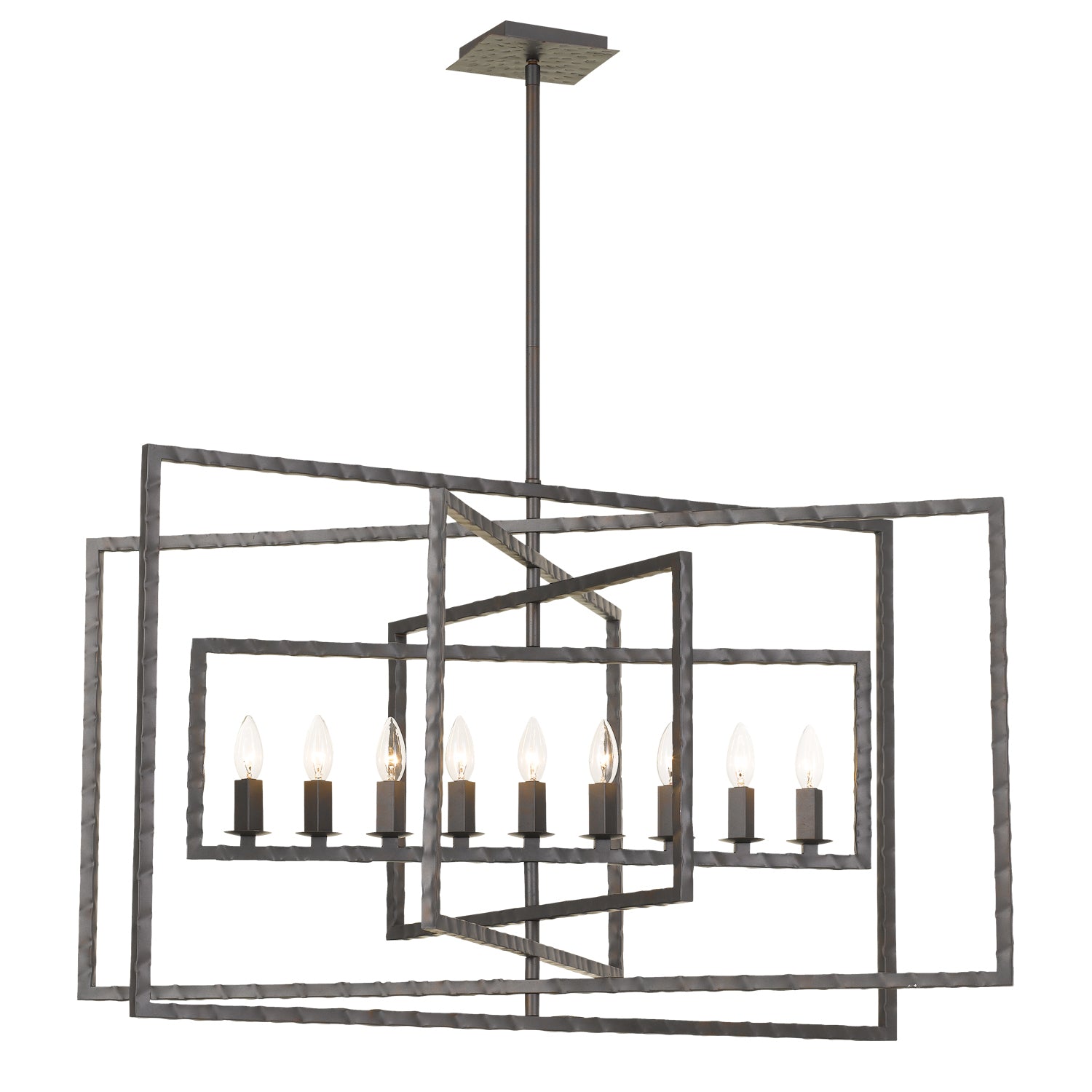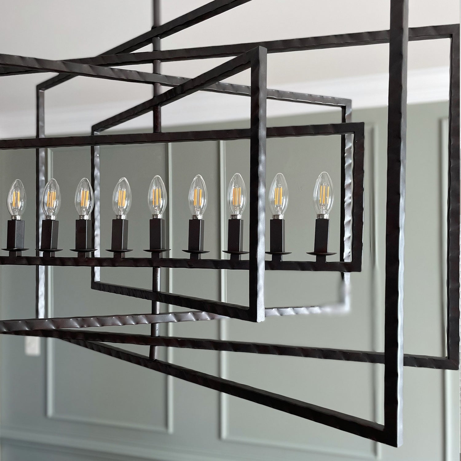 A conversation piece, the Capri chandelier's geometric design, gives the fixture an architectural feel. Designed with hammered rectangle adjustable geometric rings, the Capri can be rearranged to suit your needs.
