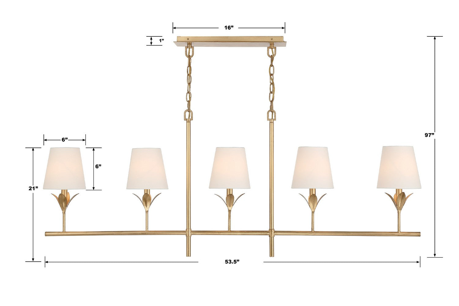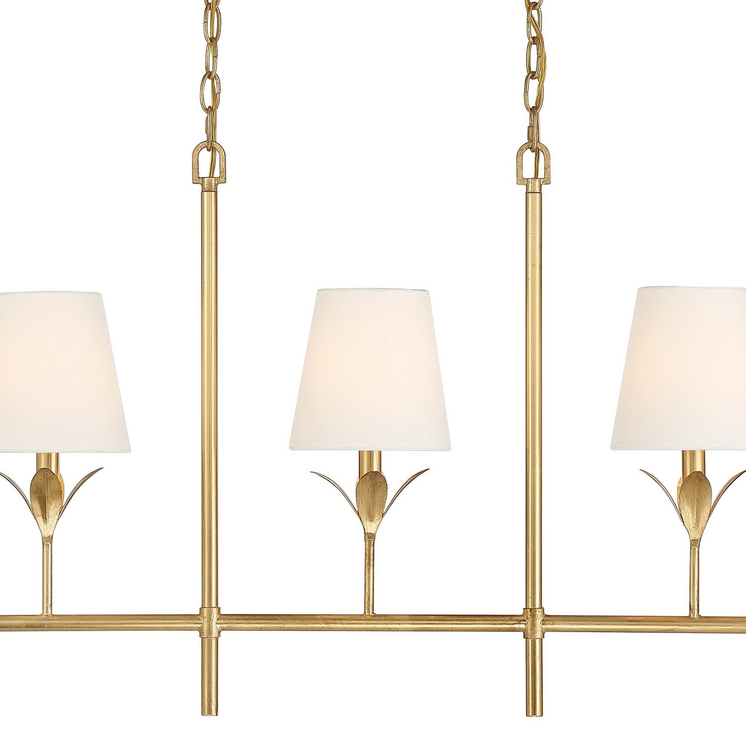 The Broche 5 Light linear Chandelier embodies a harmonious blend of traditional and modern elements. This fixture exudes timeless elegance with its candelabra-style frame and white linen shades. The layered wrought iron leaves create a stunning and functional display of light. Whether in a dining room, or over a kitchen island, this chandelier adds a touch of refined glamour to any space, making it perfect for transitional and modern designs.