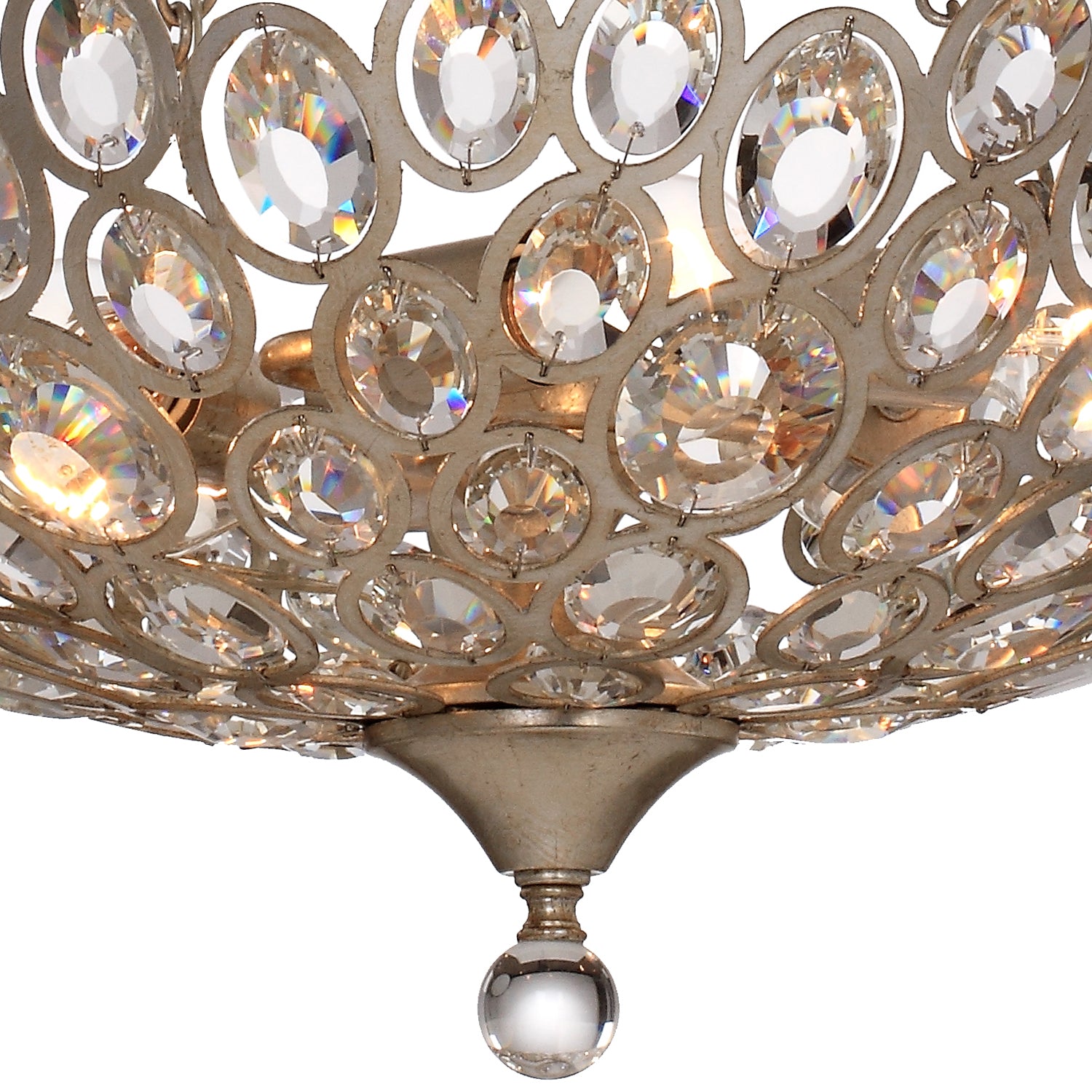 Elegantly embellished with jewel inspired crystals, the Sterling collection exudes an aura of romance. Hand cut crystal gems organically encrust the fixture and are accented by a distressed twilight finish, which is the perfect mixture of silver and gold tones. The eclectic flair of this light is perfect for a variety of home decor styles, but are definitely an opulent statement.