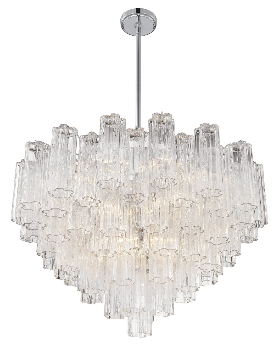 The captivating Addis Lighting is a modern-day interpretation of the iconic mid-century Tronchi chandelier. Inspired by its predecessor's sleek lines and geometric shapes, the Addis features a Polished Chrome or Aged Brass metal frame that exudes sophistication and style. Its unique design showcases transparent tiers of textured Tronchi glass tubes, forming a mesmerizing 5-point rounded star shape. Choose from a range of glass colors, including clear, amber, smoke, and white, or the stunning Autumn and Spring options, which feature a captivating multicolor disposition. The Addis Collection offers various sizes and finishes, allowing you to find the perfect fit for your space while adding a touch of timeless elegance.