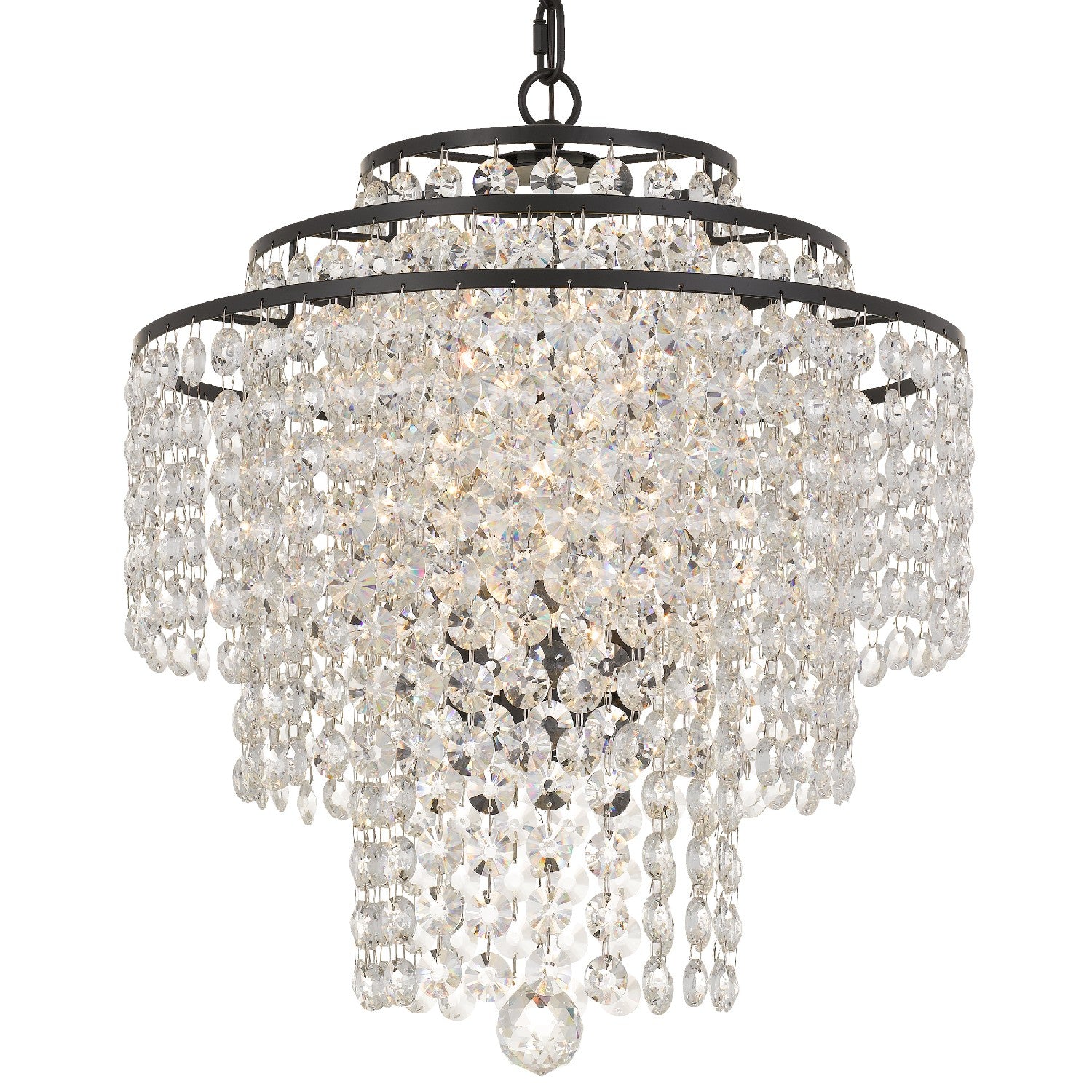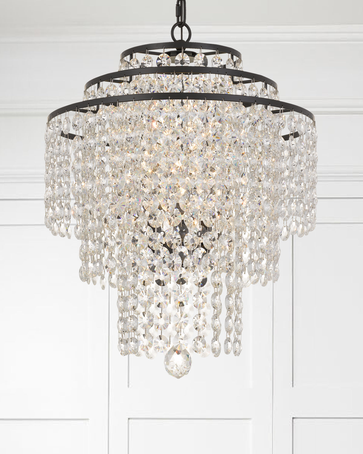 Layers of cascading crystal strands are arranged on a circular tiered frame creating optimal sparkle. A perfect complement to enhance your space, this chandelier will dazzle a room with its beautiful silhouette.