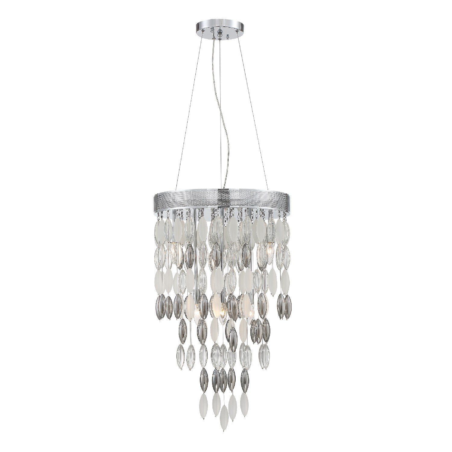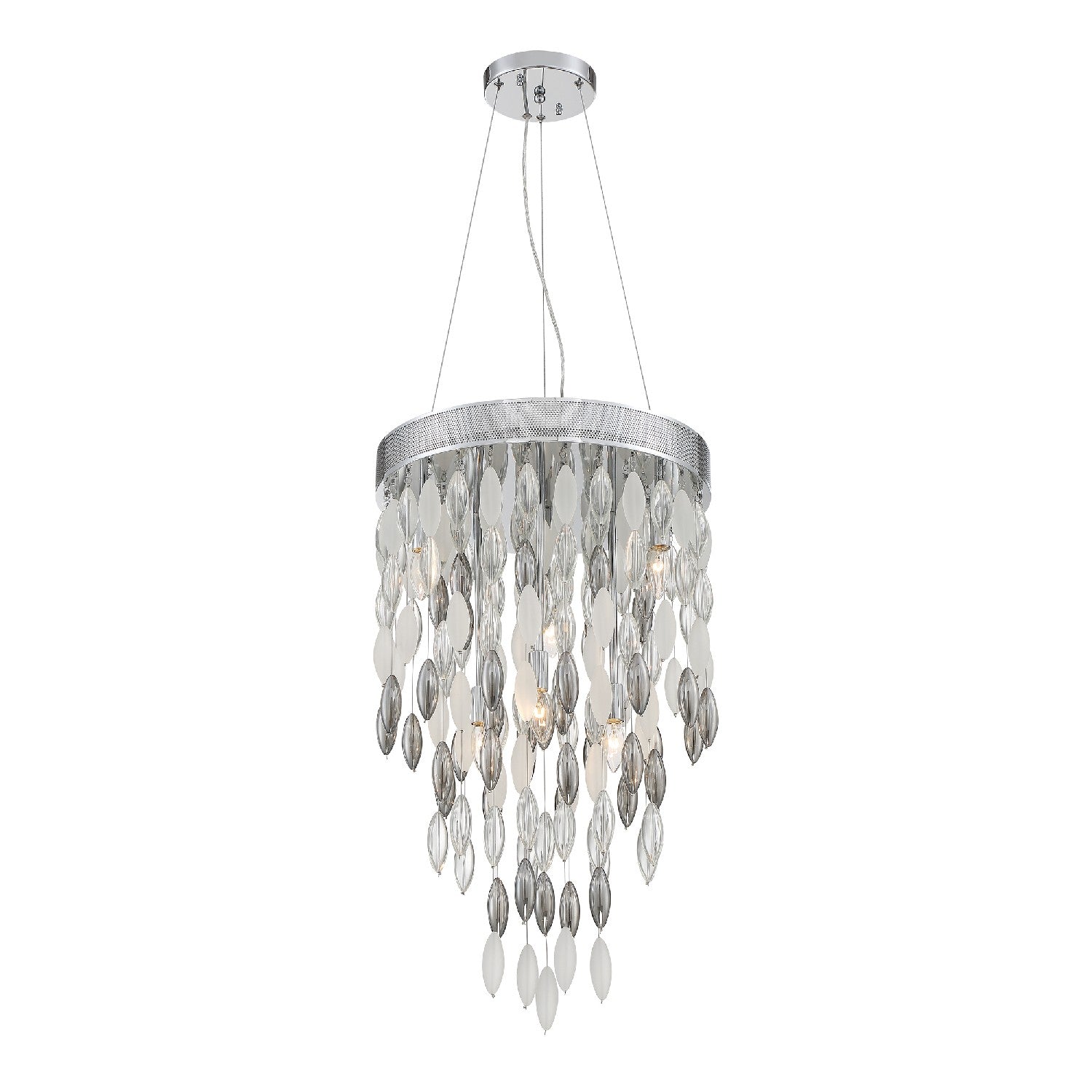 The Hudson collection features sparkling oversized solid glass beads in clear, frosted, and silver shadow cascading gracefully from its thick perforated metal base. The tiered presentation of multiple strands of oval glass offers a diffused ambiance that adds a sense of refinement and sophistication to many spaces and décor styles.