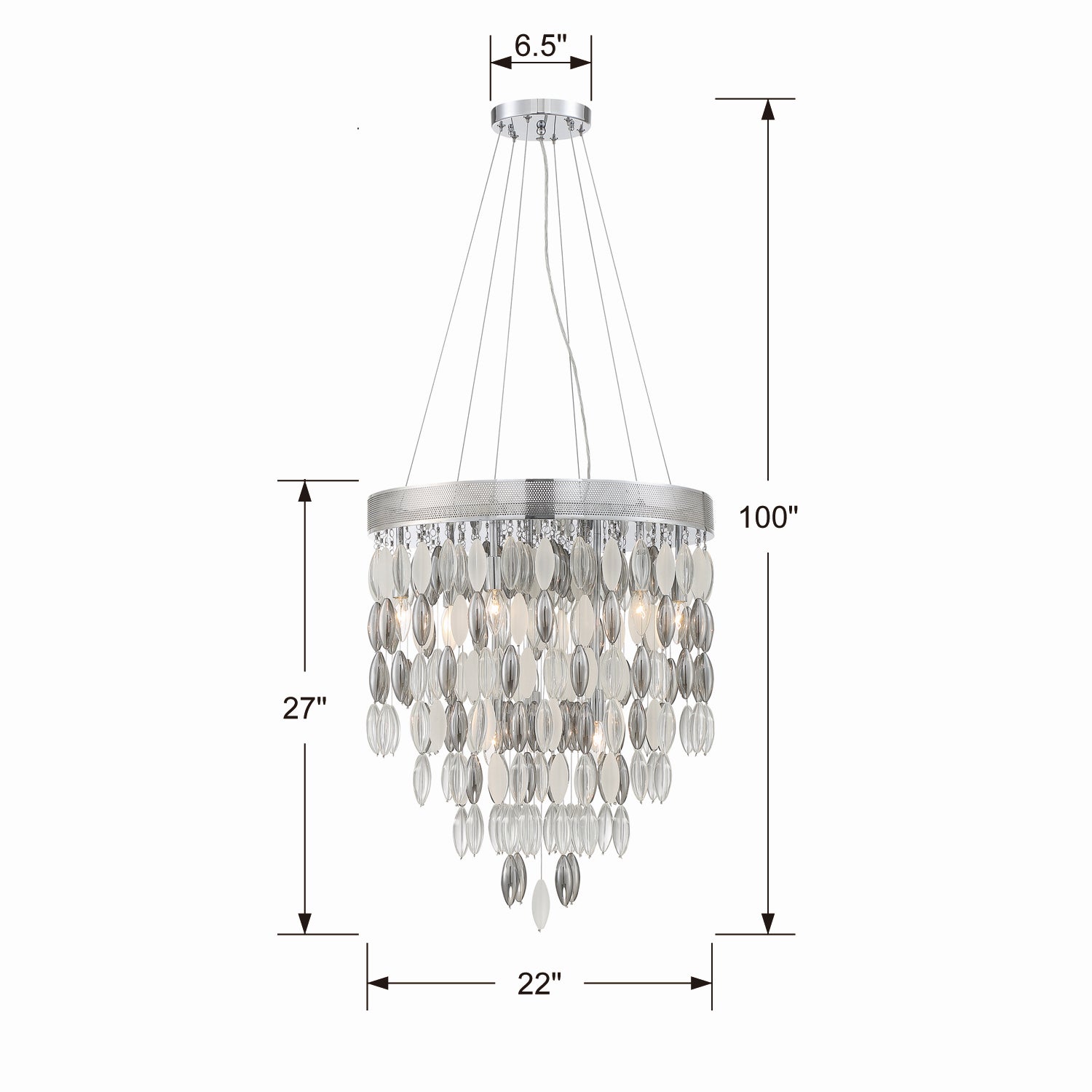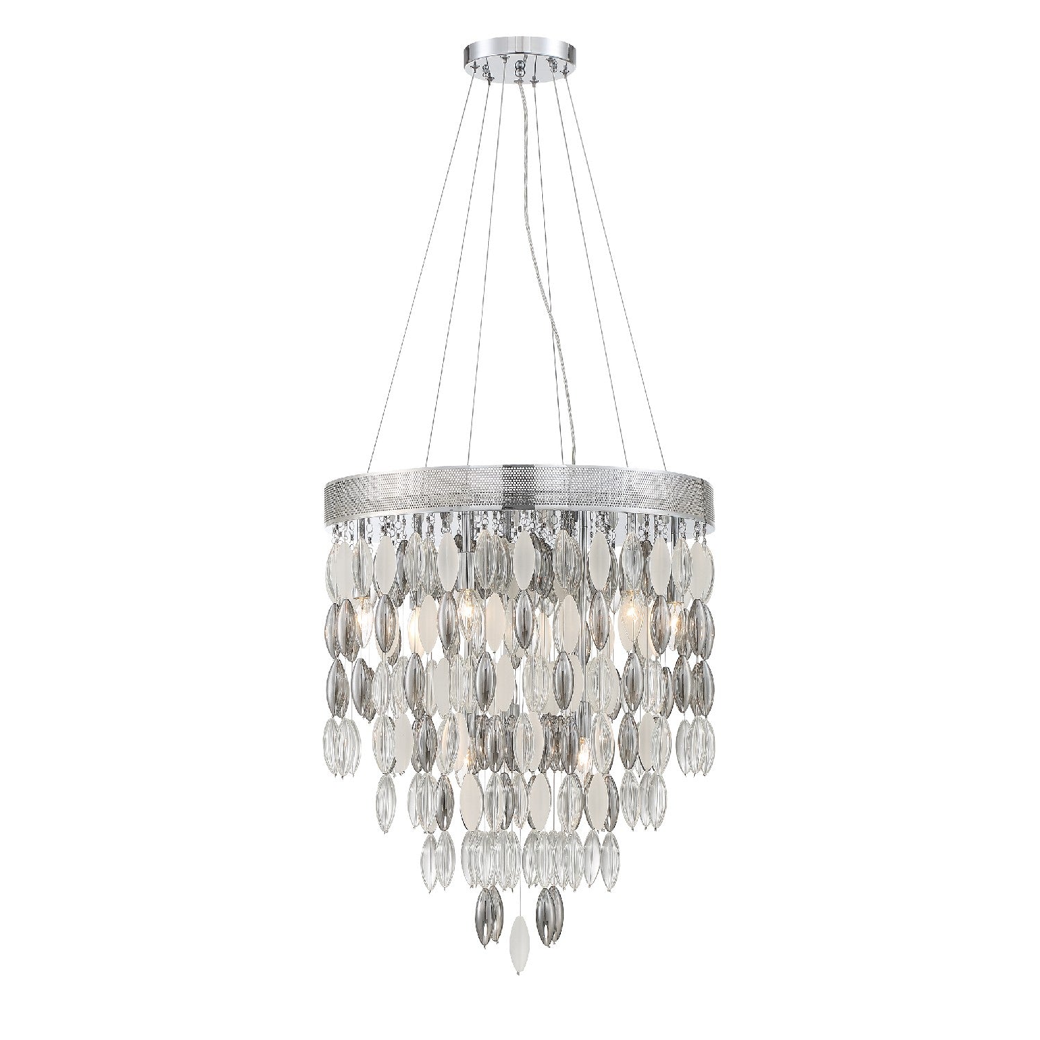 The Hudson collection features sparkling oversized solid glass beads in clear, frosted, and silver shadow cascading gracefully from its thick perforated metal base. The tiered presentation of multiple strands of oval glass offers a diffused ambiance that adds a sense of refinement and sophistication to many spaces and décor styles.