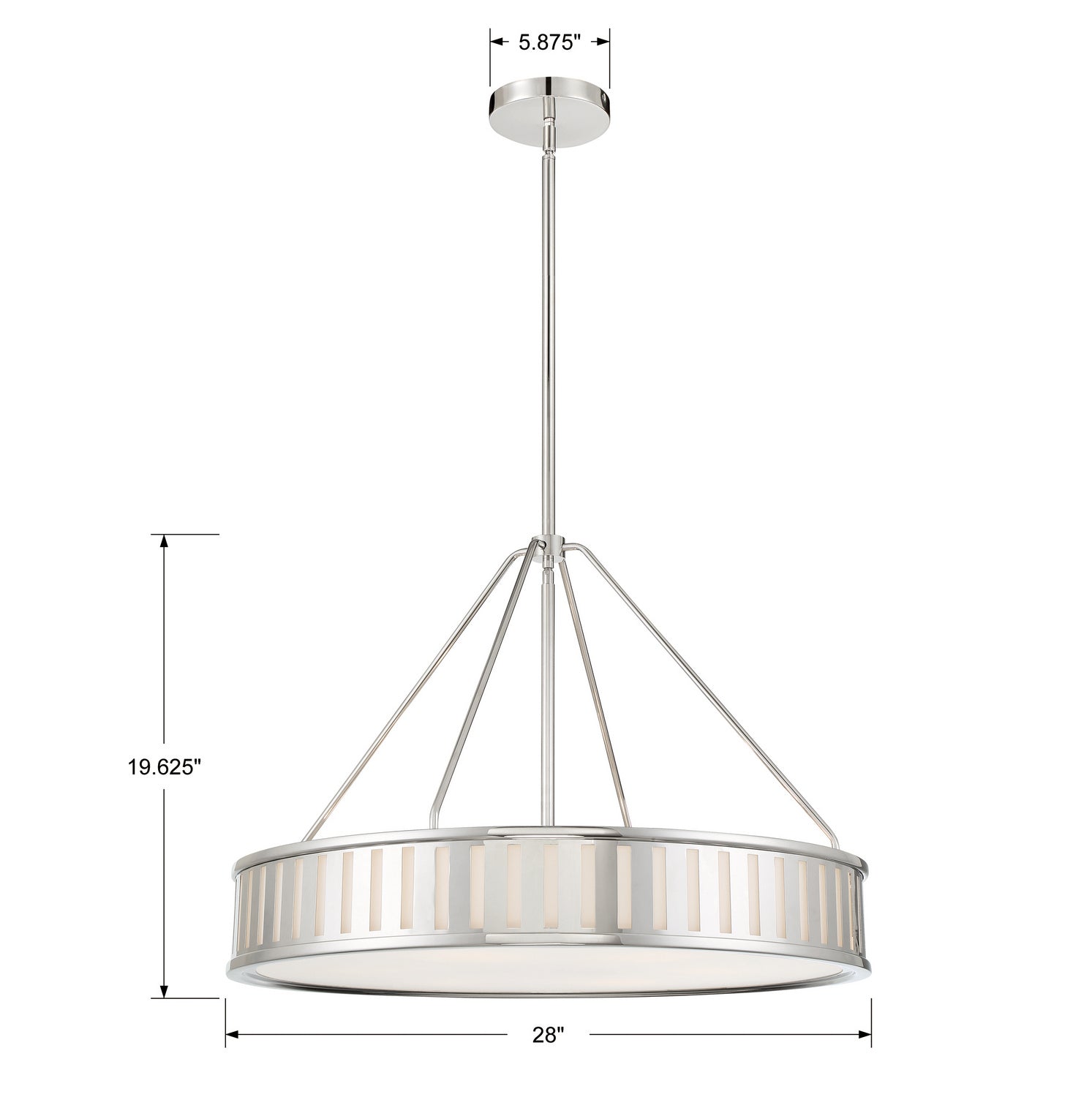 The contemporary Kendal collection makes a statement with its graphic uniform pattern. Its metal frame surrounds white glass in this elegant drum-shaped pendant. The high contrast of Vibrant Gold, Black Forged, or Polished Nickel against white glass is a great way to add a touch of drama to a room.
