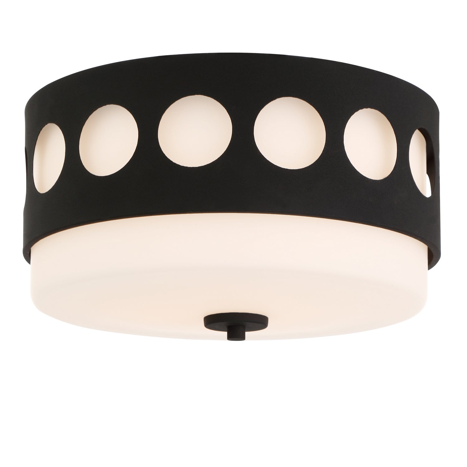 The drum-shaped Kirby ceiling mount sends focused light to a space. A perfect choice for low ceilings, the solid white glass, and circular geometric metal overlay pattern is a stylish choice for various spaces.