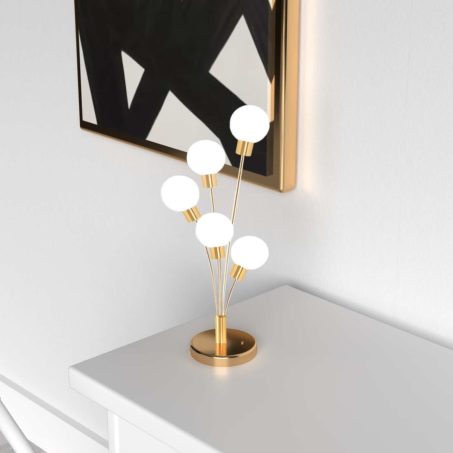 The inspiration for the Budding Branch family of lighting is obvious - the beauty of nature at its peak. Available in either floor or desk configurations, it's a bright and beautiful design with a unique silhouette. The metal frame in your choice of finish springs up from a substantial round base into five branches, each set with a glass globe light. Illumination is cast all around, and softened by your choice of glass finish. With its singular profile and nature-inspired style, Budding Branch family works with transitional and modern décor schemes in a bedroom, living room or fashionable office space.
