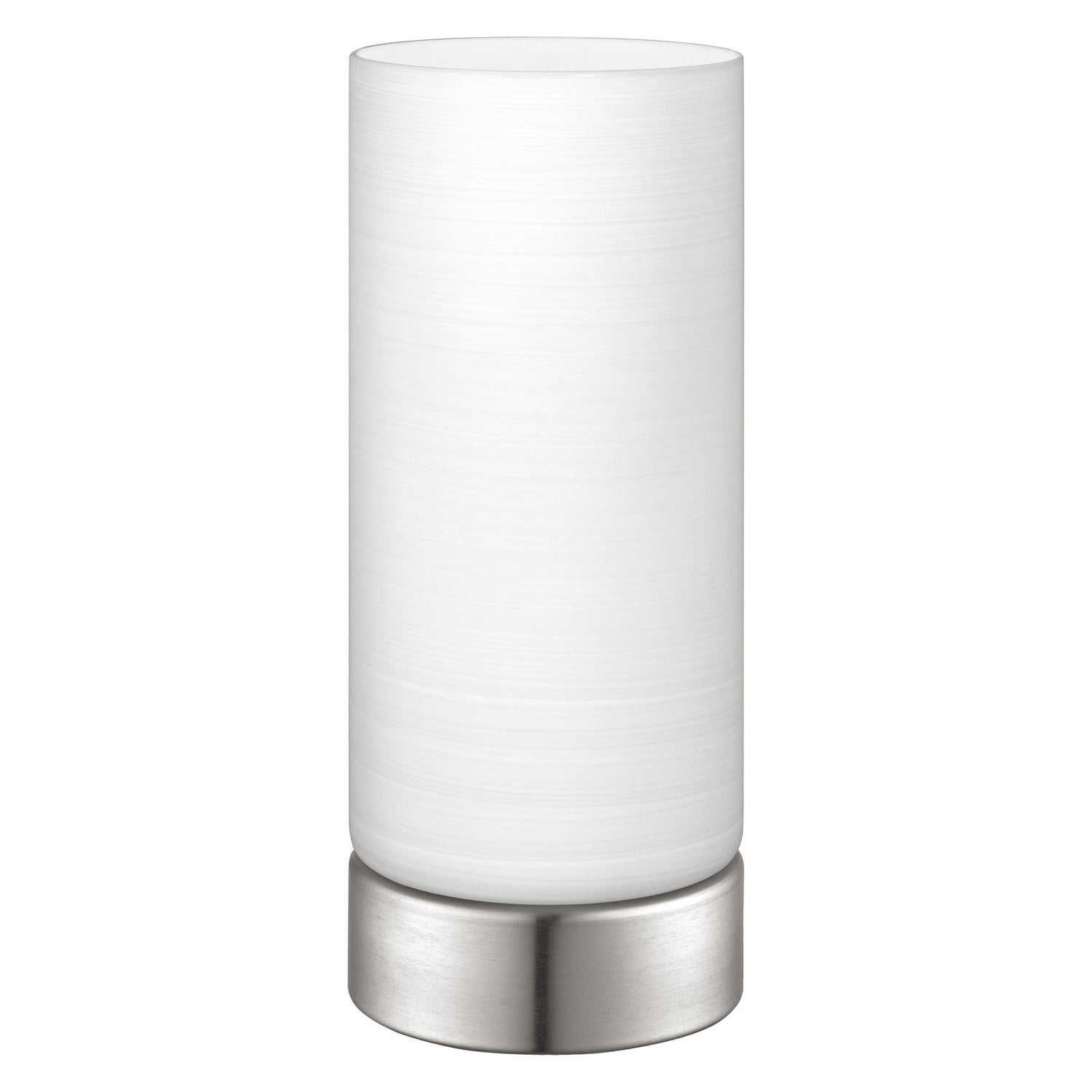 Add a contemporary touch to your room with the Mayna table lamp with a matte nickel base and cylider white wiped glass . Whether it's to illuminate an office, living room, or bedroom, this table lamp brings a touch of sophistication and charm to your decor. This light will instantly transform your space.
