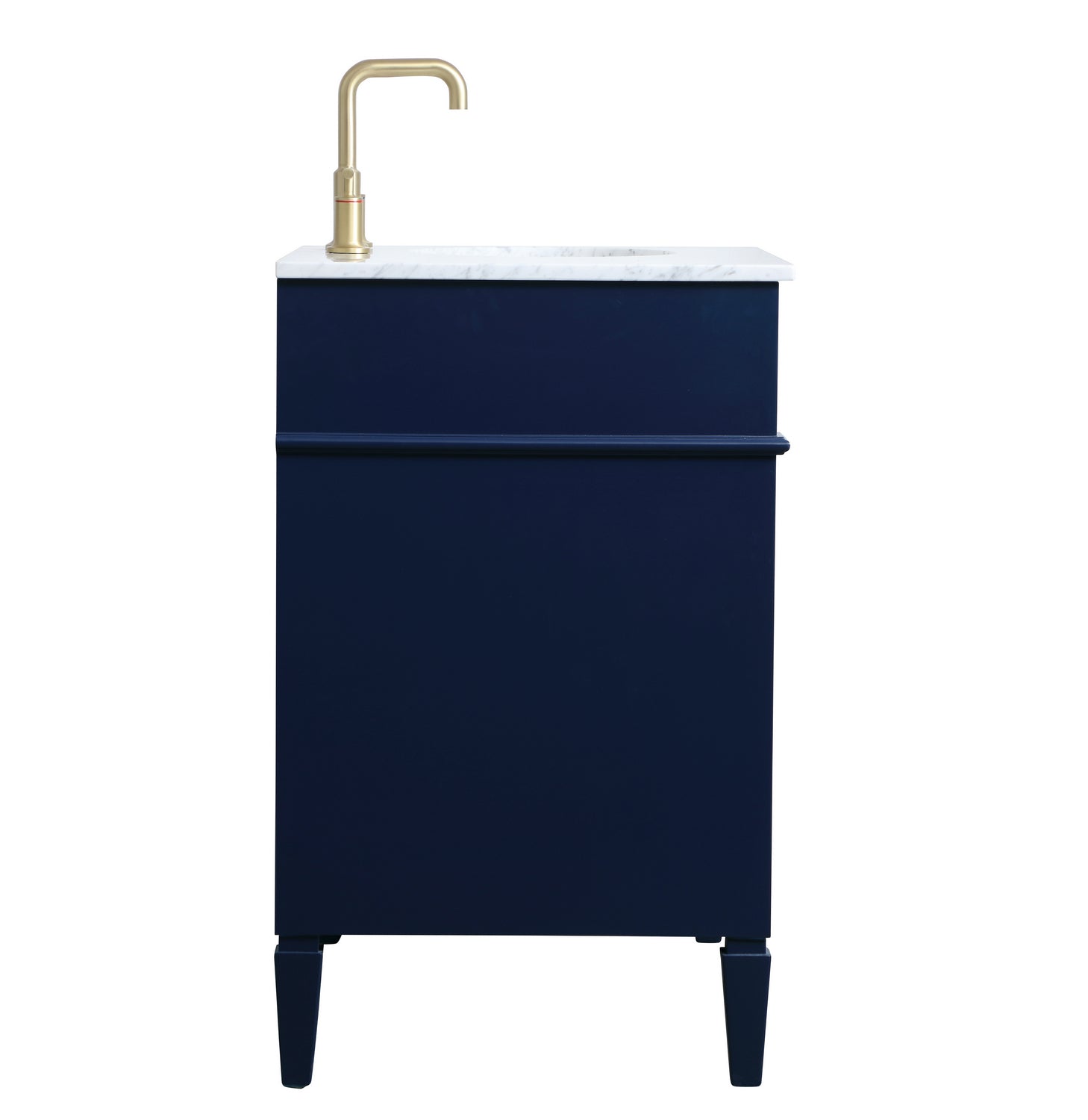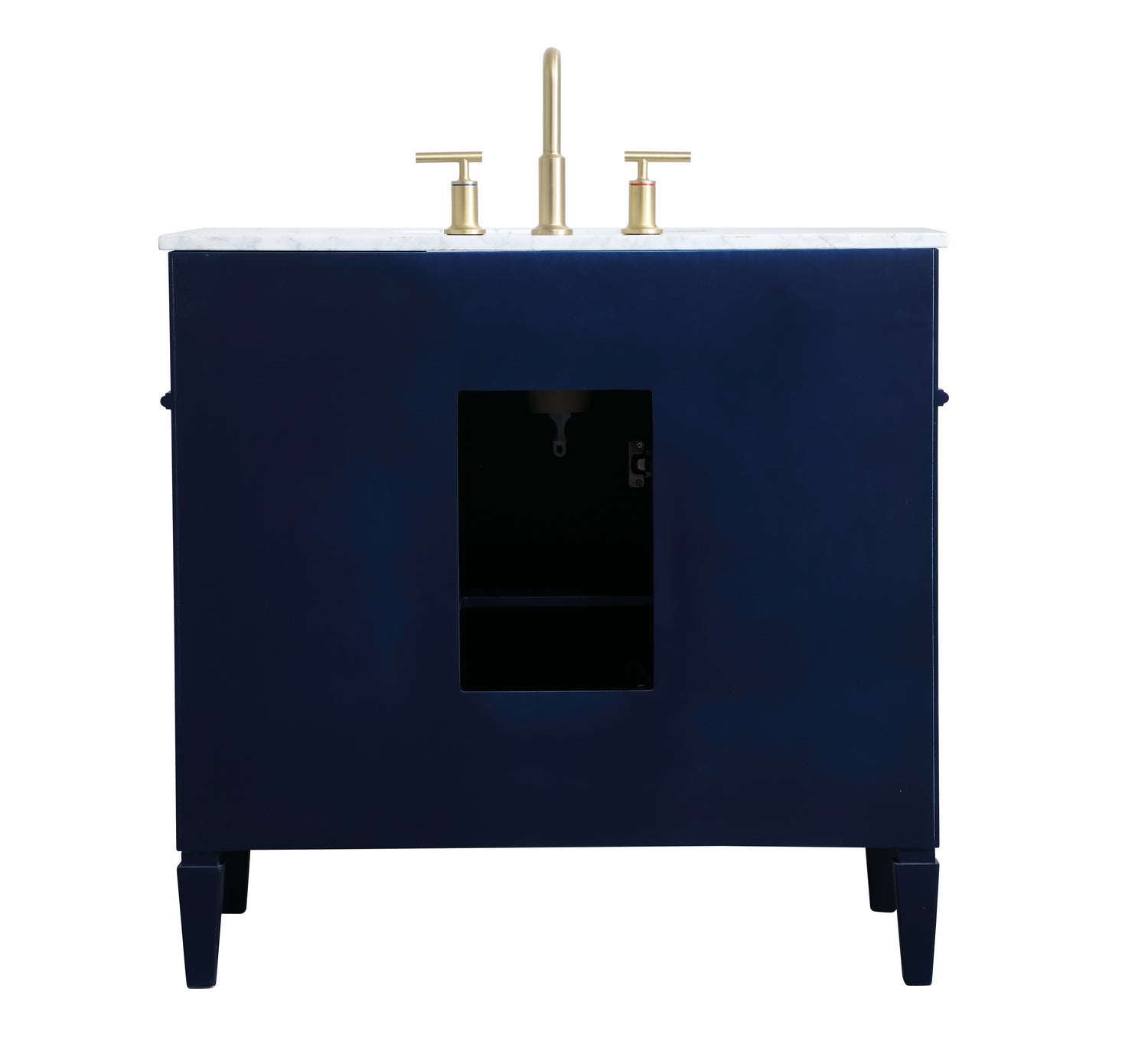 Modern sophistication is defined within the urbane blue finish and brushed gold knobs of this vanity. Its length makes it the perfect addition to any sized home, and saves space with its storage area hidden behind the double cabinet doors and 3 side drawers. Topped with a Carrara white marble counter top and a porcelain sink, this design will add everlasting class to your bathroom and powder room.