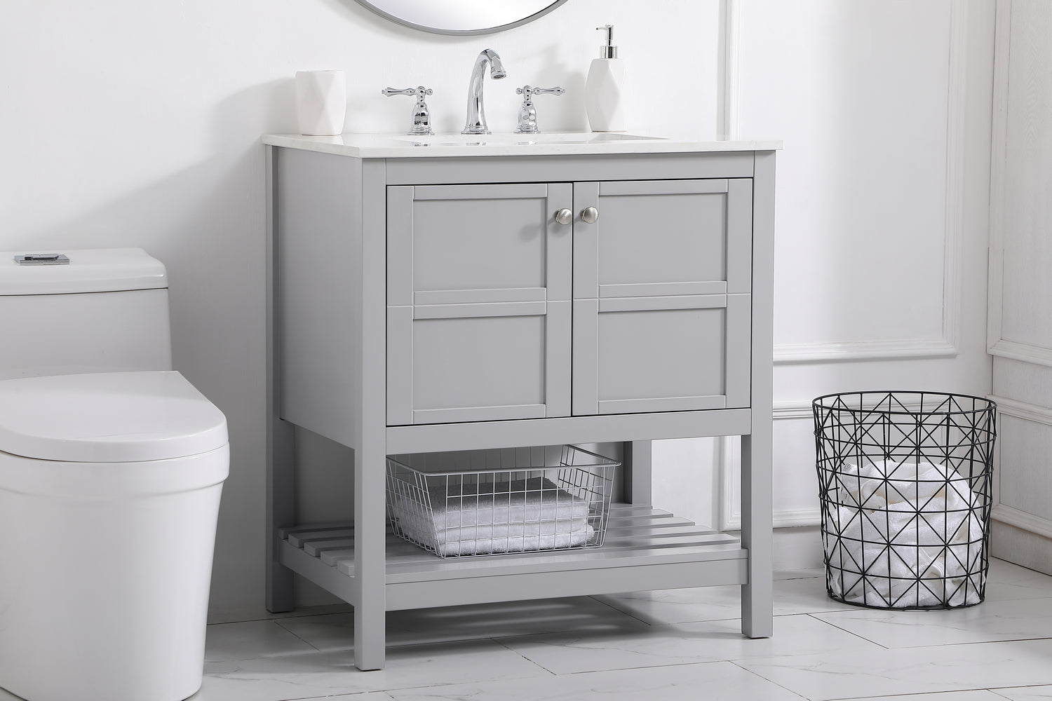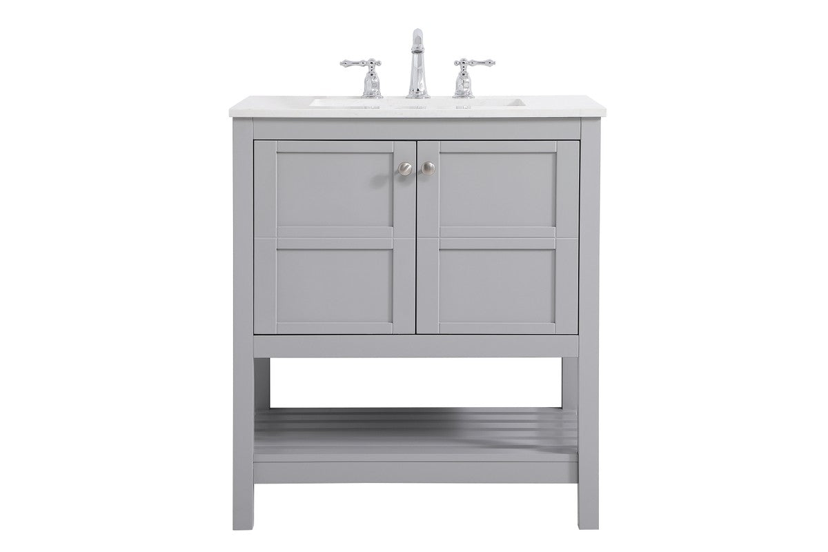 The subtle beauty of the Theo collection 30" vanity in a gray finish exudes comfortable luxury. Its modern, yet traditional beauty will surely dress up your bathroom or powder room without any fuss. The white stone countertop and porcelain undermount sink shows quiet opulence, and the legs support upright without fail. Brushed Nickel hardware complements the trendy gray finish, with pulls adorning the two cabinet doors, showcasing ample storage space within. Slated shelf allows for additional space to organize your towels. Whether this vanity is in your bathroom or for guests, its presence will surely elevate the aesthetics of your room.