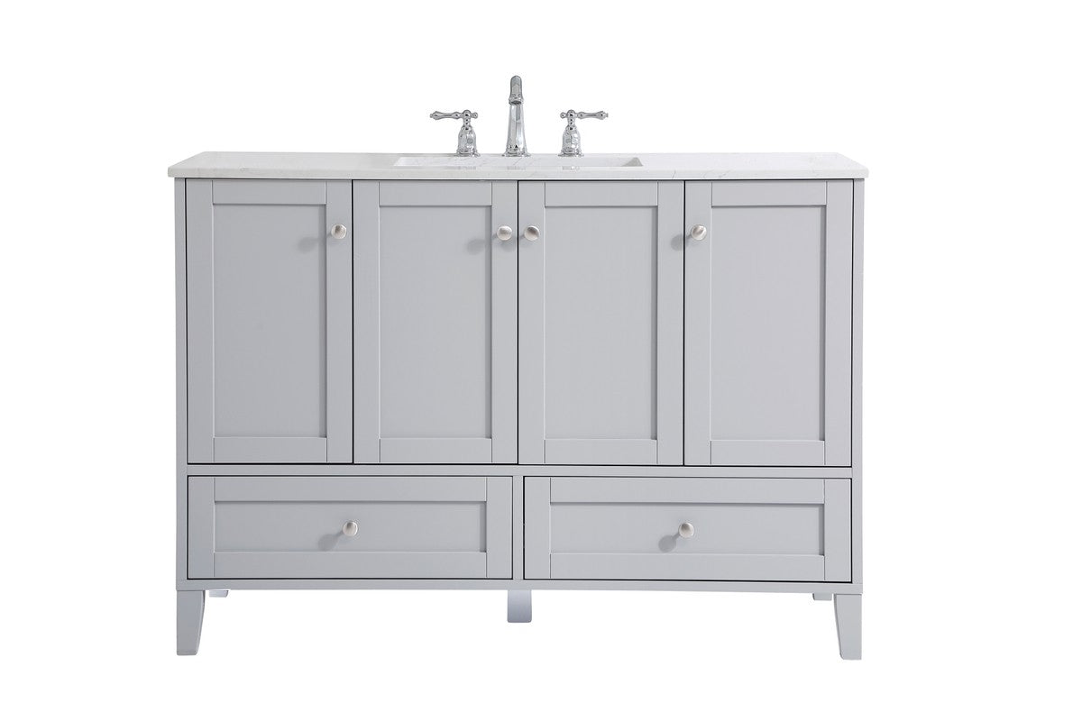 While unassuming, this 48" vanity in a grey finish sure knows how to redefine luxury. The sleek brushed nickel knobs adorn the 4 cabinet doors and 2 bottom drawers which allow you to store your bathroom toiletries and necessities. Standing strong on oblique legs and dressed with a Calacatta engineered marble countertop, this vanity will surely create beauty and casual elegance in your bathroom or powder room.