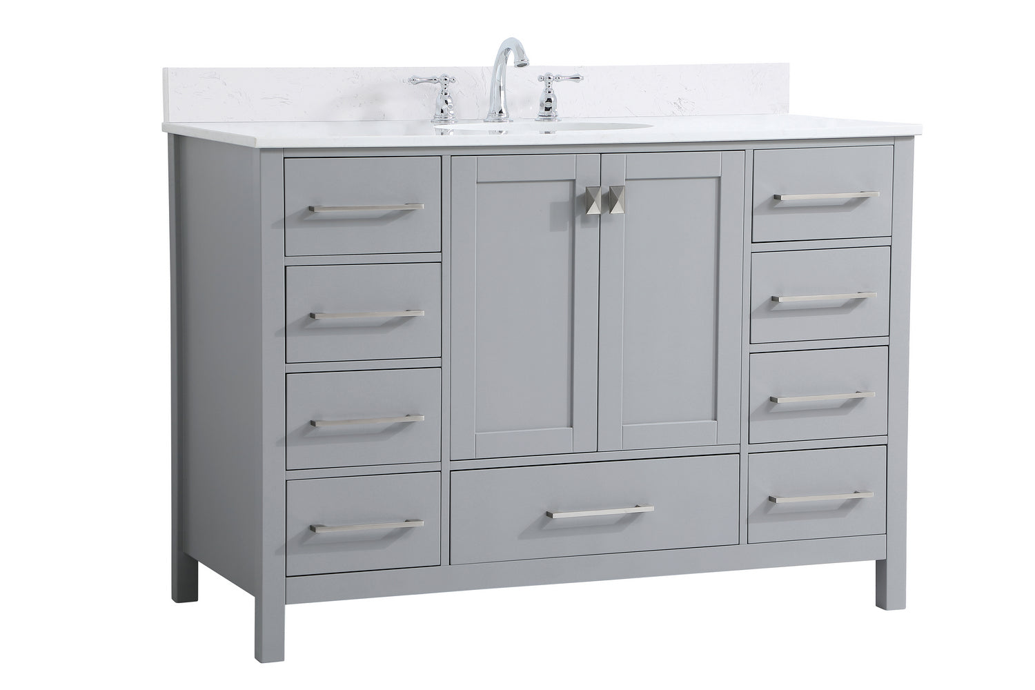 Never compromise beauty--the Irene collection stunning vanity in a gray finish will add lovely sophistication and complement any bathroom or powder room, while utilizing its charm and function to provide you with ample storage spaces. Brushed nickel pulls gently adorn the minimalist cabinet doors and drawers at the base, allowing for you to store away your bathroom essentials. The calacatta engineered marble countertop, porcelain undermount sink, dignified subtle engravings on the side edges, and squared legs all come together to create contemporary beauty. Work with your space, and design a beautiful room, no matter the size. Comes with a matching backsplash to complete the look and protects your wall.