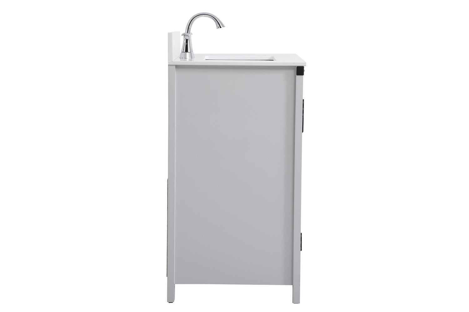 The Grant Collection 36 in. vanity is a practical and stylish upgrade for your bathroom. Its grey finish is highlighted by the engineered white stone top featuring an under-counter rectangular sink. The cross patterned cabinet doors are decorated with bold black hinges and bar pulls. The cabinet has four pullout drawers, ideal for towels, washcloths and bath accessories Comes with a matching backsplash to complete the look and protects your wall.