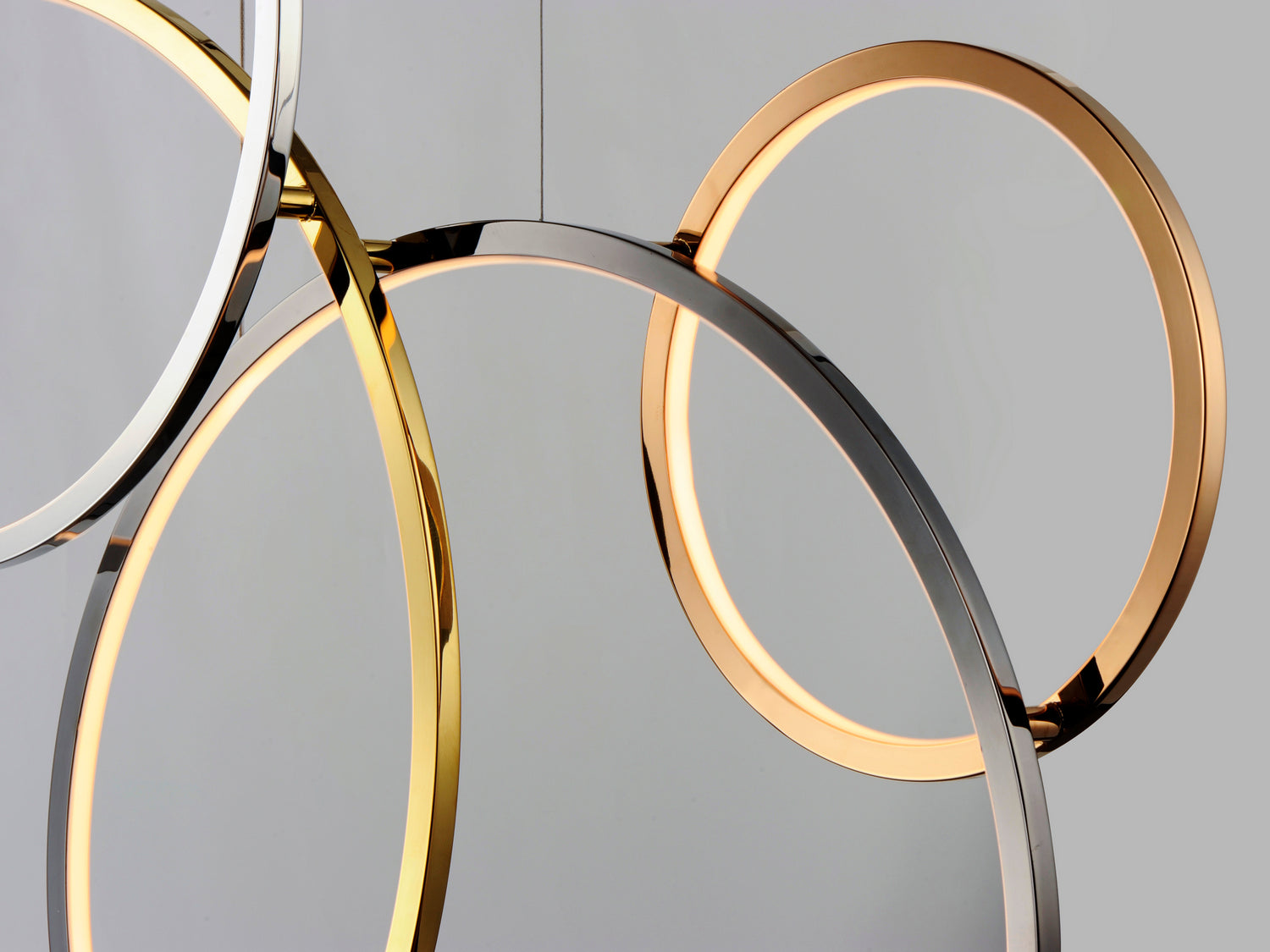 Intersecting rings for this large scale sculpture available in either vertical or horizontal configurations. Multiple high end finishes were used to blend in with today's eclectic interiors. The perfect fixture to fill a large space, this can also be installed against the wall as artwork.