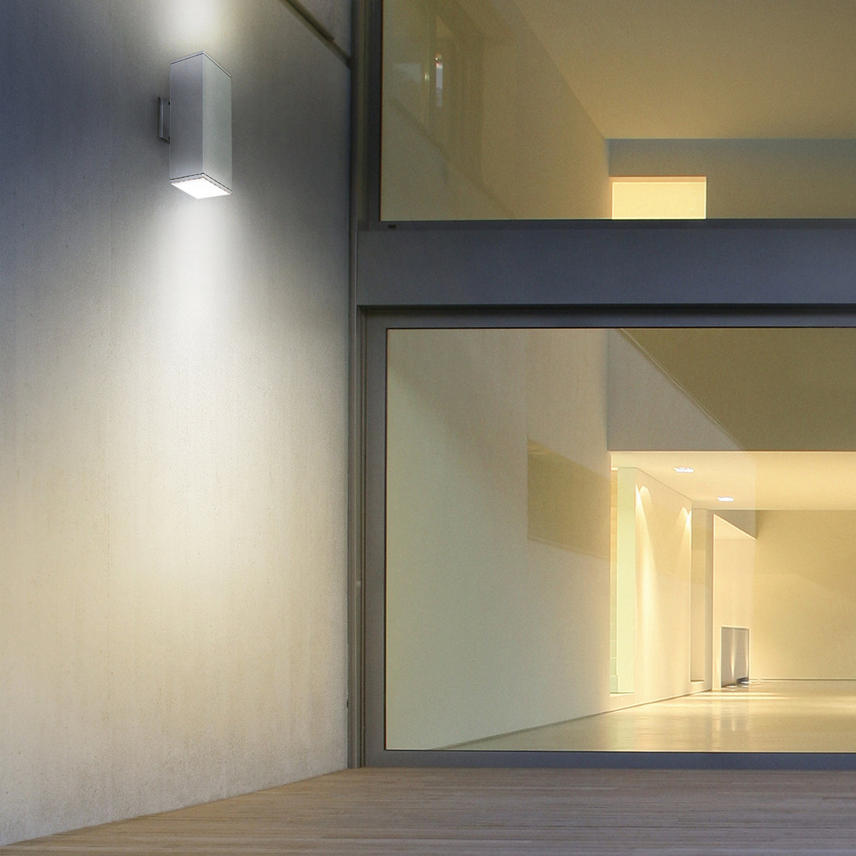 Square wall light for up-and-down lighting. Exterior grade. Cast aluminum construction with powder coat paint. Clear glass lens, unit is completely enclosed.