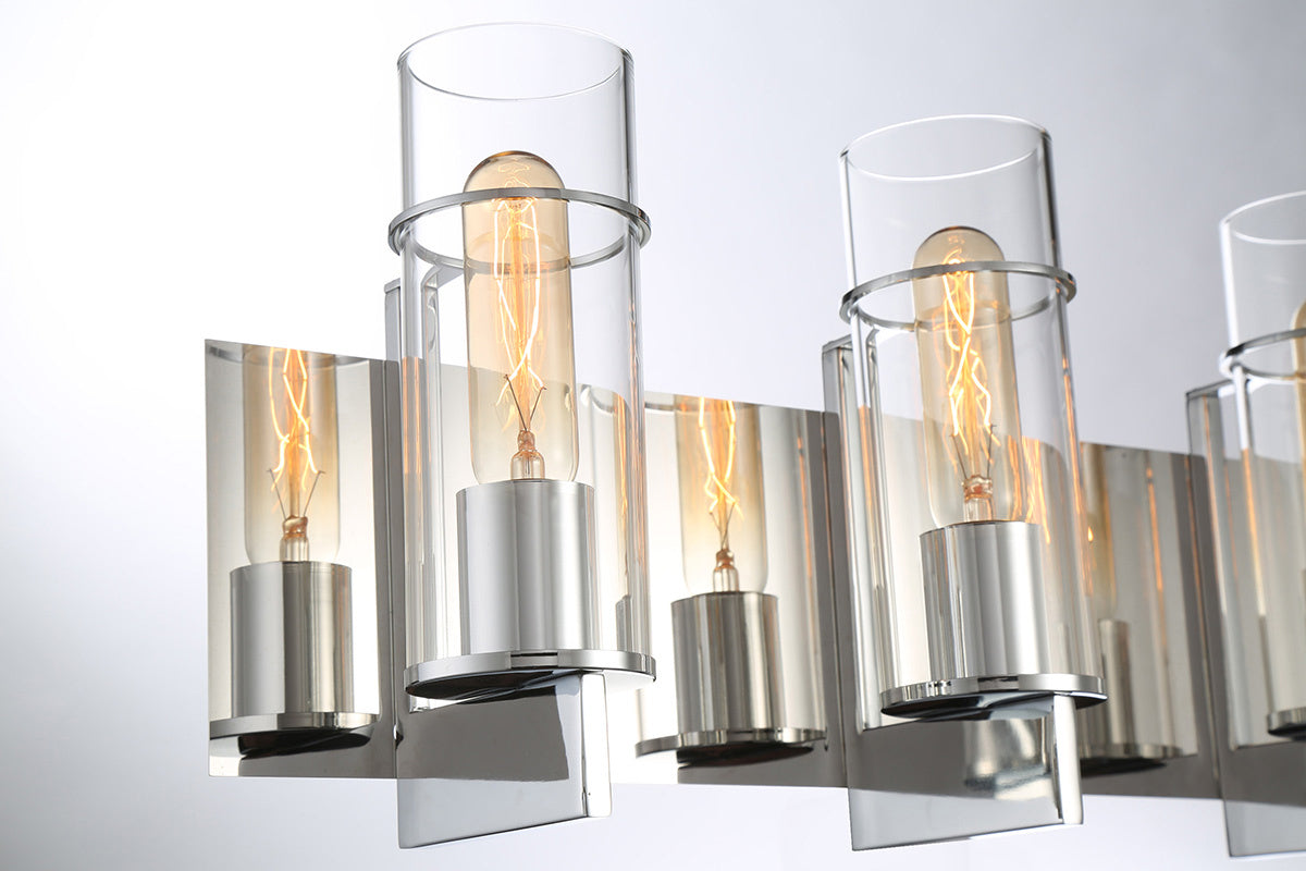 Clear glass cylinders featuring vintage bulbs are perched above slim brackets and held by a slender chic ring. An inviting warm glow radiates from the fixture through the transparent glass, showcasing the beautiful detail of each filament.