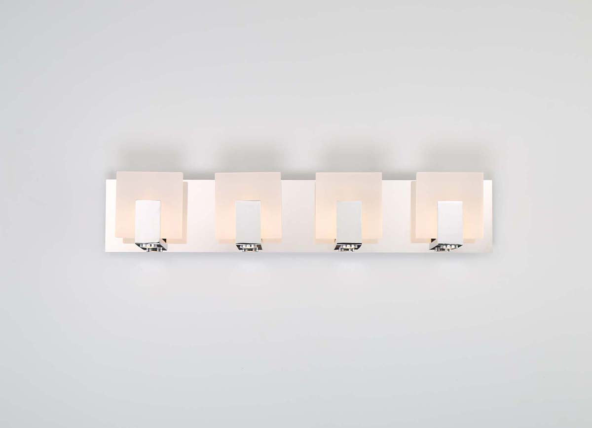 Illuminated acrylic diffusers are vertically seated on a chrome frame. The frosted acrylics provide a softened glow while the downlight offers a more concentrated beam.