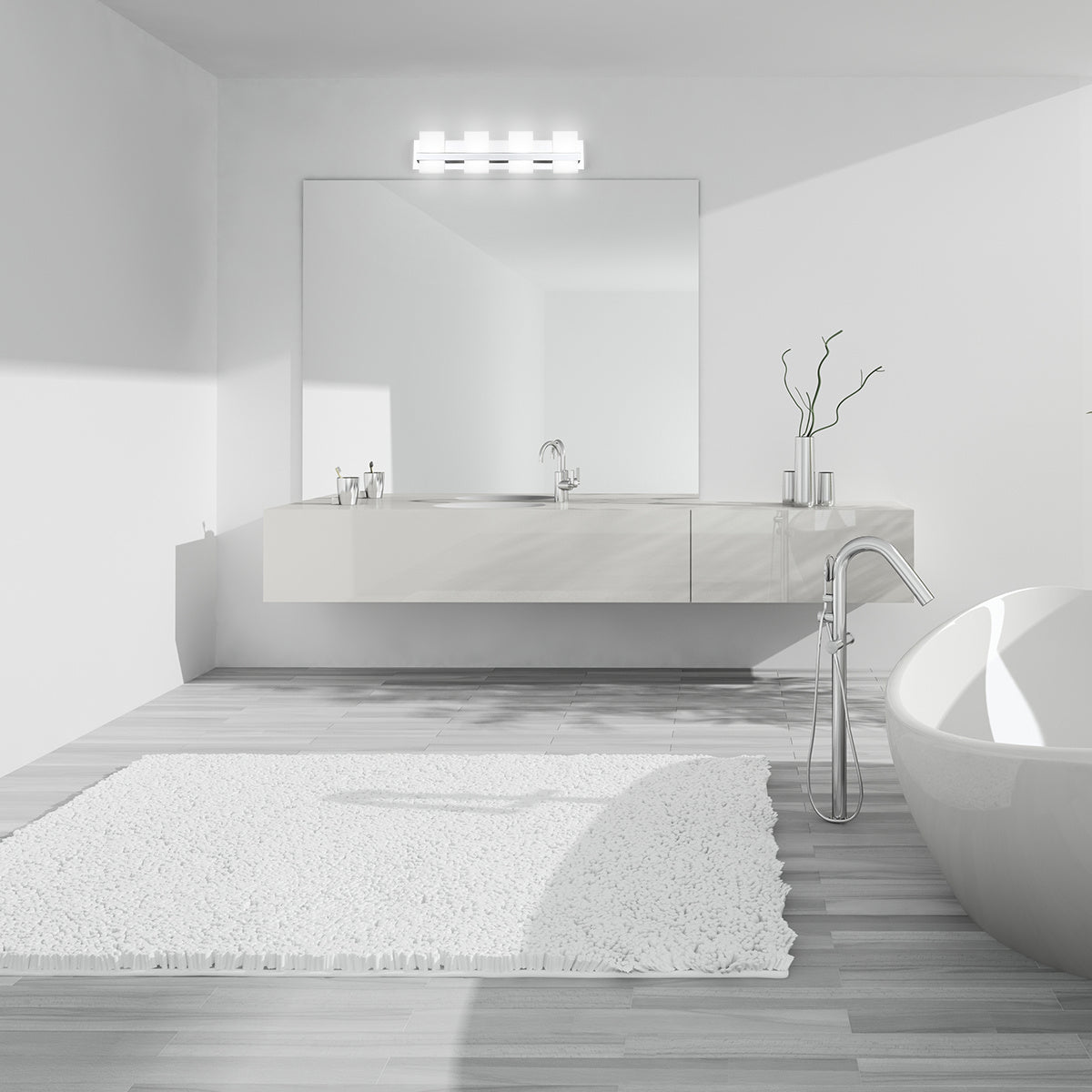 A frosted acrylic prism is nestled in a chrome frame structure exuberating modern excellence. A strong architectural form is accentuated by the strong lines in its design.
