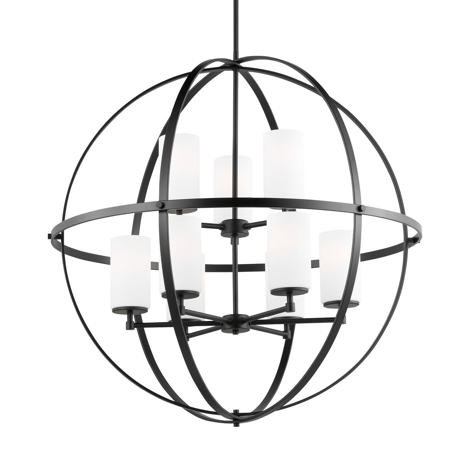The Alturas nine-light multi-tier chandelier in Midnight Black provides abundant light to your home, while adding style and interest. The silhouette of the modern Alturas lighting collection by features an interlocking, spherical steel frame, which harkens back to the Unisphere constructed for the 1964 New York World's Fair. The minimalist Alturas Collection draws the eye to the soft, warm glow of the light emitted from the cylindrical Satin Etched glass shades. The full assortment includes three-, five- and nine-light chandeliers, a one-light mini pendant, a three-light pendant, a two-light semi flush which is convertible into a pendant, and one-, two-, three- and four-light bath fixtures. All fixtures are offered in Brushed Oil Rubbed Bronze, Brushed Nickel, Midnight Black and Satin Brass finishes, the bath fixtures are also offered in Chrome finish. Incandescent and ENERGY STAR-qualified LED lamping are available, all fixtures are California Title 24 compliant