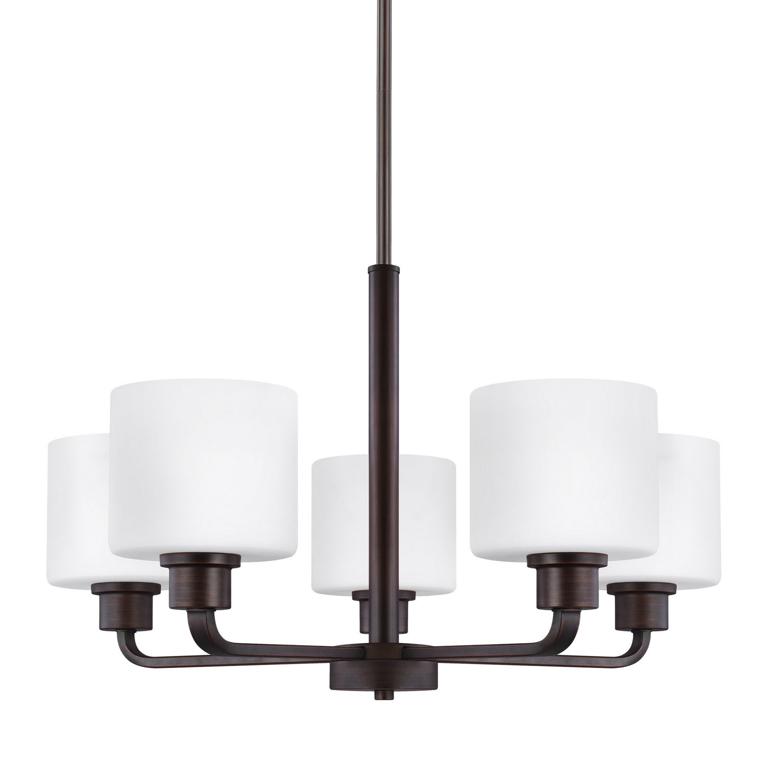 The Canfield five light single tier chandelier in bronze provides abundant light to your home, while adding style and interest. Behind every seemingly simple design lies unerring attention to restraint and obsessive attention to the tiniest details. The Canfield collection by draws on the modernist traditions of "less is more". Essential functional elements dictate the aesthetics, and clean lines prevail. Layers of intricately finished hand-brushed steel progress vertically to the soft glow of light diffused through finely etched glass diffusors. Canfield offers a "whole home" lighting solution, offering lighting in every imaginable category from the auspicious 15 light 3-tier chandelier, to the concise mini-pendant and one-light sconces. The collection is available in hand brushed Burnt Sienna for a warm, tactile, almost Craftsman design style, or a brushed nickel to emphasize the more architectural elements of your interior.