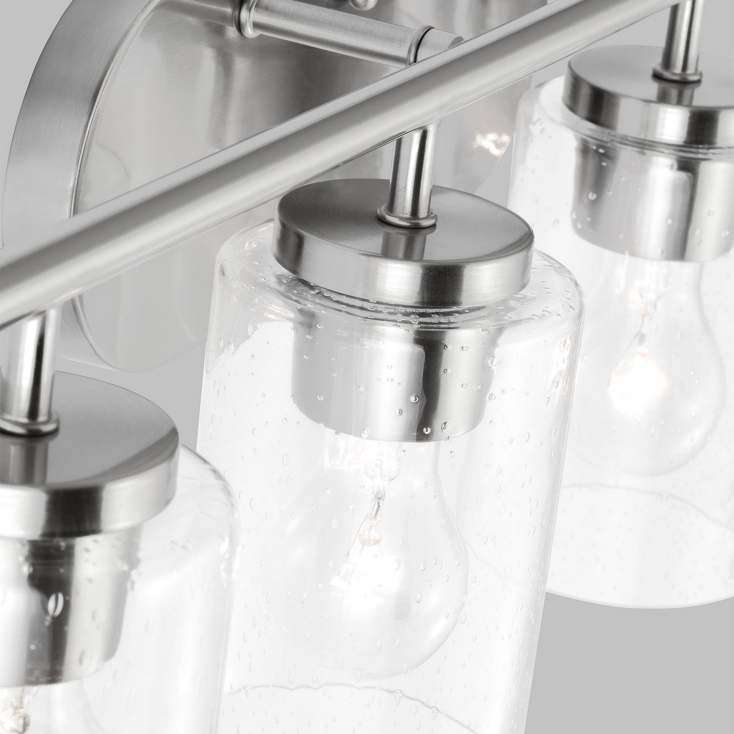 The Oslo four light vanity fixture in Brushed Nickel offers shadow-free lighting in your powder room, spa, or master bath room. The Oslo lighting collection by is a sleek design, with smooth and clean lines. The Clear Seeded glass adds to this collection's contemporary and minimalist character. Offered in Chrome, Brushed Nickel, Bronze and Midnight Black finishes, the collection includes nine-, five-, and three-light chandeliers, mini pendant, both flush and semi-flush ceiling fixtures, as well as one-, two-, three- and four-light wall/bath fixtures. Both incandescent lamping and ENERGY STAR-qualified LED lamping are available. All fixtures are California Title 24 compliant.