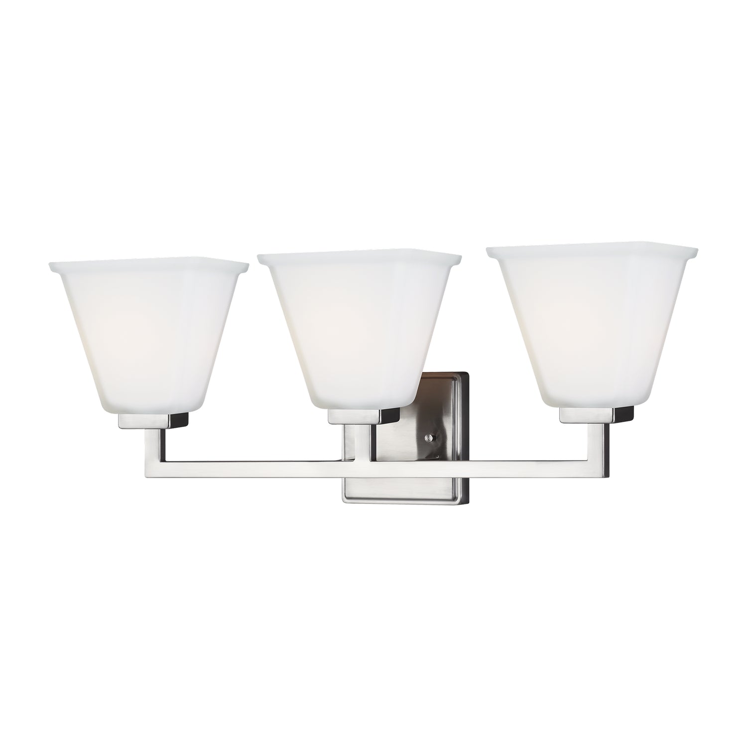 The Ellis Harper three light vanity fixture in brushed nickel offers shadow-free lighting in your powder room, spa, or master bath room. Ellis Harper has an Arts and Crafts pedigree with a Modernist twist. The array of fixtures showcases the commitment to high style with robust construction and craftsmanship at an exceptional price. The subtle detail allows this transitional design to easily fit into any decor. The sleek, geometric arms and square Satin Etched glass shades add touches of elegance to its streamlined profile. The assortment includes: four- and eight-light chandeliers, a six-light linear, one-light mini-pendant, and one-, two-, three- and four-light bath fixtures. All fixtures are offered in either a Brushed Nickel or Brushed Oil Rubbed Bronze.