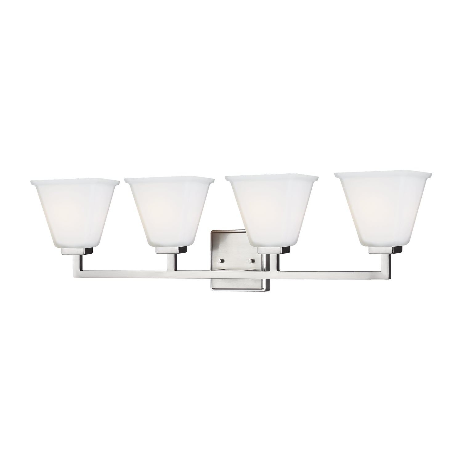The Ellis Harper four light vanity fixture in brushed nickel is an ENERGY STAR qualified lighting fixture that uses LED bulbs to save you both time and money. Ellis Harper has an Arts and Crafts pedigree with a Modernist twist. The array of fixtures showcases the commitment to high style with robust construction and craftsmanship at an exceptional price. The subtle detail allows this transitional design to easily fit into any decor. The sleek, geometric arms and square Satin Etched glass shades add touches of elegance to its streamlined profile. The assortment includes: four- and eight-light chandeliers, a six-light linear, one-light mini-pendant, and one-, two-, three- and four-light bath fixtures. All fixtures are offered in either a Brushed Nickel or Brushed Oil Rubbed Bronze.