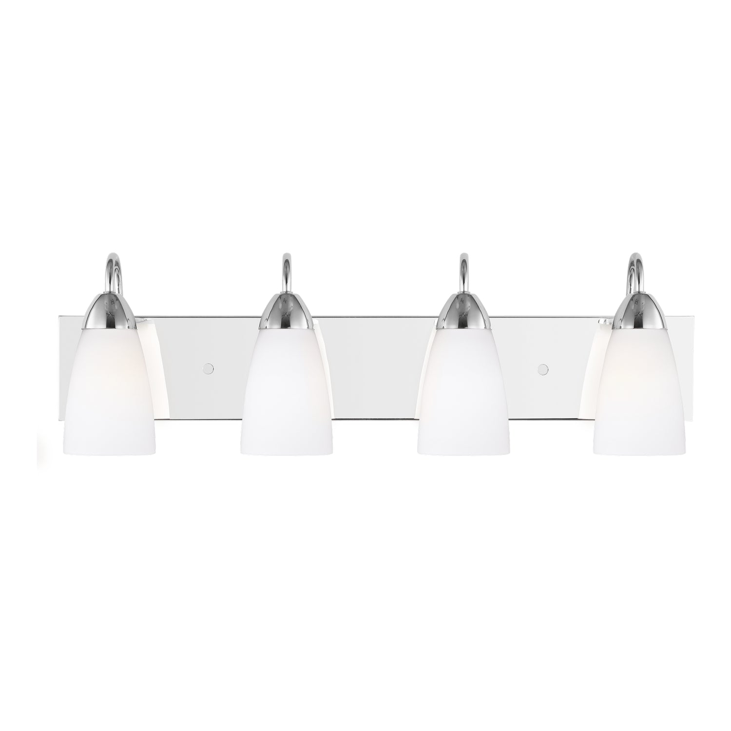 The Seville four light vanity fixture in chrome offers shadow-free lighting in your powder room, spa, or master bath room. The Seville collection represents commitment to high style at a sharp price. The modernist design is epitomized by the teardrop curves in the arms tipped by Etched glass diffusors throughout the chandeliers and bath fixtures. The collection offers a "whole home" lighting solution in every imaginable category. The assortment includes nine-light, five-light, and three-light chandeliers (either with up-light or down-light), pendants in four sizes as well as one-light, two-light, three-light , four-light and five-light wall/bath fixtures. Install a stylish and elegant addition to any room in the house. Seville is offered in Brushed Nickel and Burnt Sienna finishes.