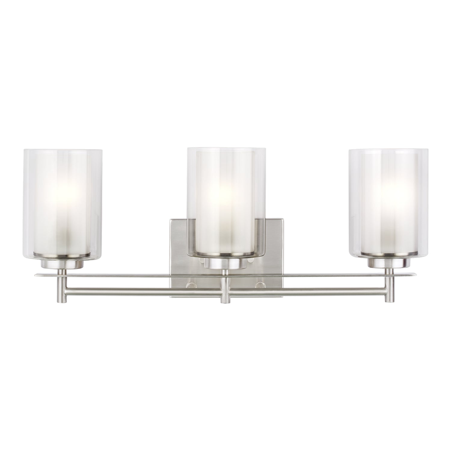 The Elmwood Park three light vanity fixture in brushed nickel is an ENERGY STAR qualified lighting fixture that uses LED bulbs to save you both time and money. Elmwood Park by has clear glass tube shades with an inner white glass element that softens the light and helps cast an even glow. A cylinder of etched glass is centered within a larger cylinder of clear glass which encircles each light bulb to create this stunning visual effect. The full assortment includes three-, five-and nine-light chandeliers, a four-light linear, one-light mini pendant, a three-light pendant, a two-light semi flush which is convertible into a pendant, and one-, two-, three- and four-light bath fixtures. All fixtures offered in either a Brushed Nickel or Brushed Oil Rubbed Bronze. Incandescent and ENERGY STAR-qualified LED lamping are available, all fixtures are California Title 24 compliant.