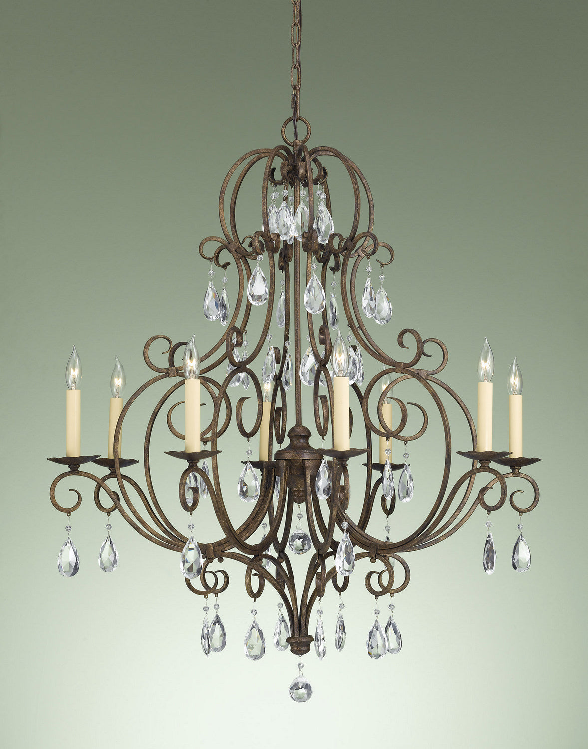 The Chateau eight light single tier chandelier in mocha bronze is the perfect way to achieve your desired fashion or functional needs in your home. Inspired by the grand Chateaus of Southern France, the Chateau lighting collection is both delicate and detailed. Its square tube curls lyrically play into one another as the hand polished glass crystals punctuate each curl.