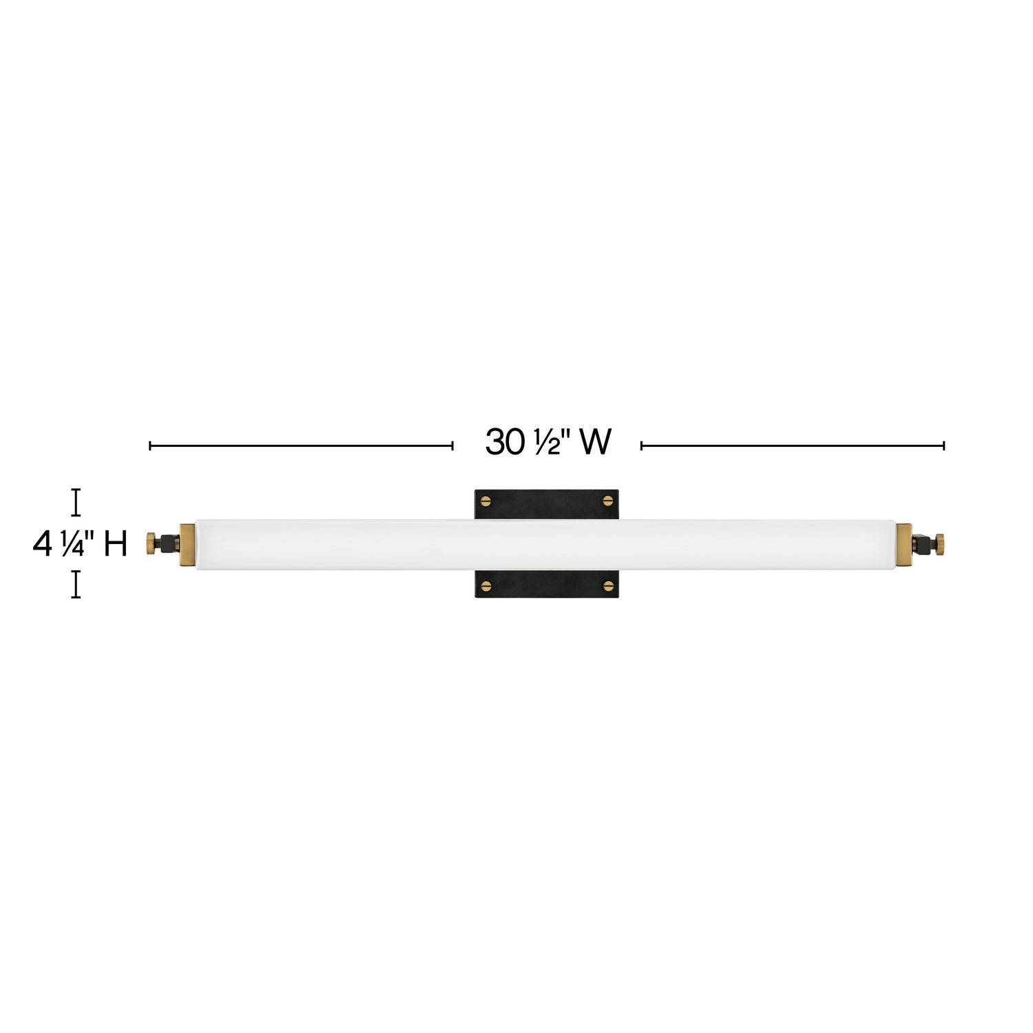 Rollins is both industrial in form and transitional in style. Unique rectangular etched opal glass has softly rounded edges offset by contrasting details on the backplate and the square knobs anchoring either end. This integrated LED design comes in two finish combinations, Black with Chrome and Black with Heritage Brass, and can be hung both vertically and horizontally.