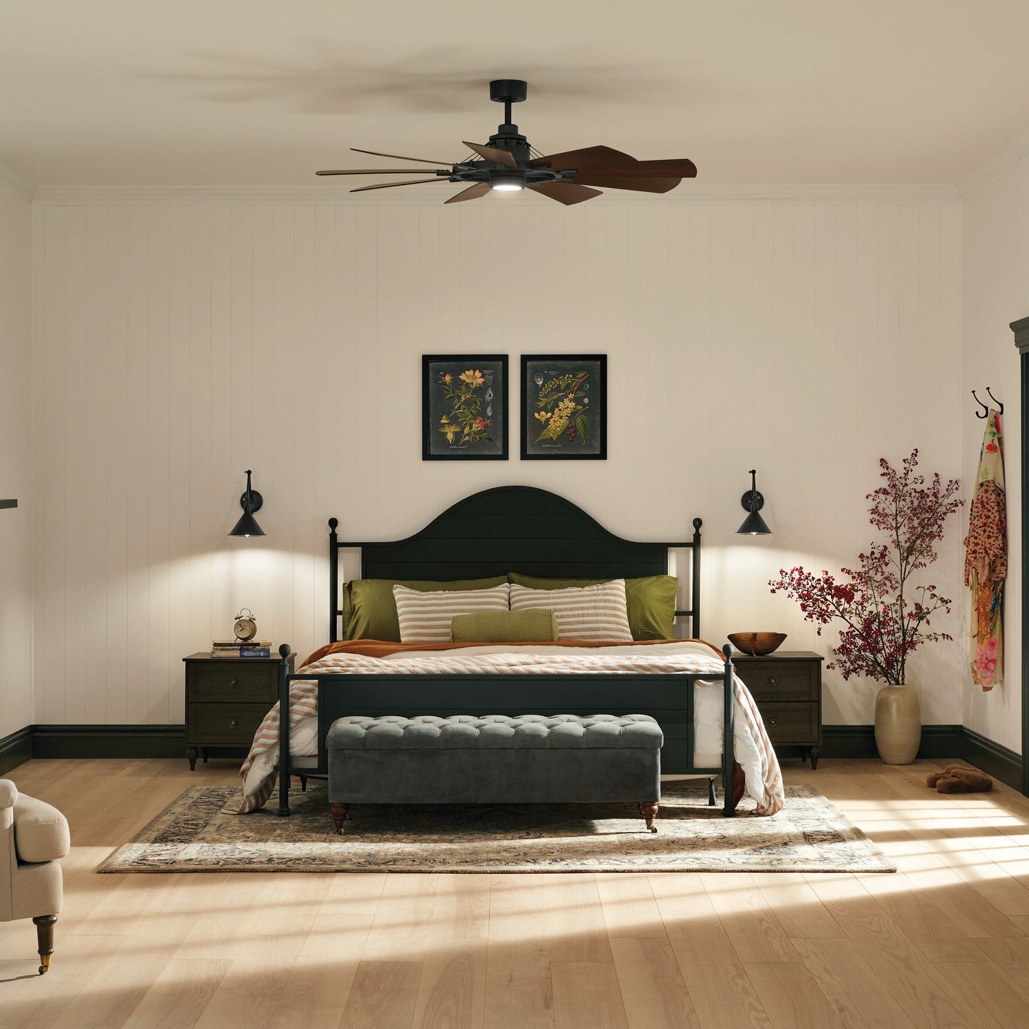 Combining rustic, industrial, and vintage elements, the Gentry collection is reminiscent of a historic farm windmill. Gentry knows how to make an impact - both visually and with airflow. Its blade design creates a stunning visual effect on or off--rounding out living spaces with a clean, modern look. Etched cased opal glass allows light to beautifully filter through—creating an air of ambience in any setting. Designed for customization, Gentry and its choice of finishes works well with multiple styles, including vintage farmhouse, homestead, or industrial.
