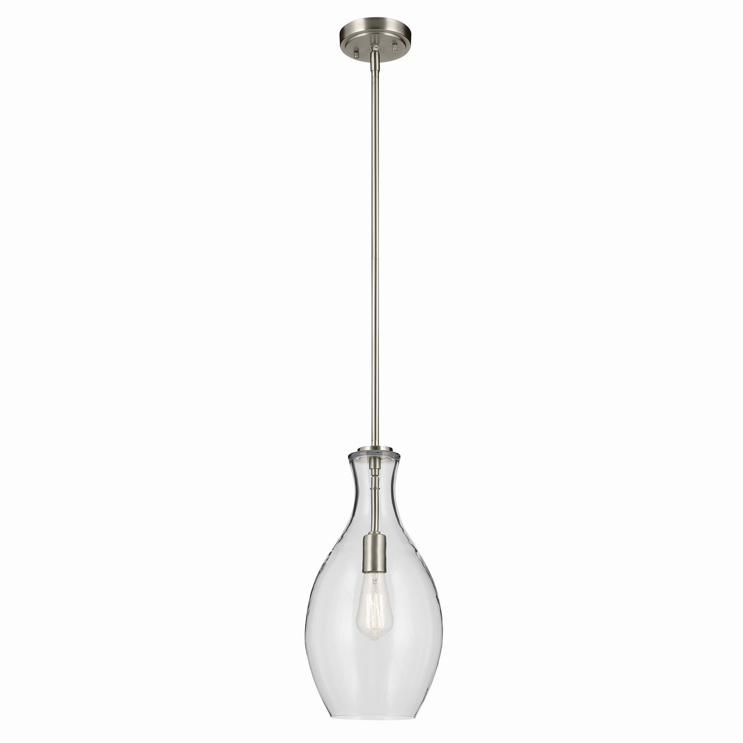 A modern style with minimal detailing, the Everly 1-light pendant easily elevates the style of soft modern environments. This elegant pendant offers a soft, curvilinear form and contemporary, clear glass silhouette that provides ambient lighting to the entire room. As beautiful as it is versatile, adjust the hanging height to meet the needs of your space.