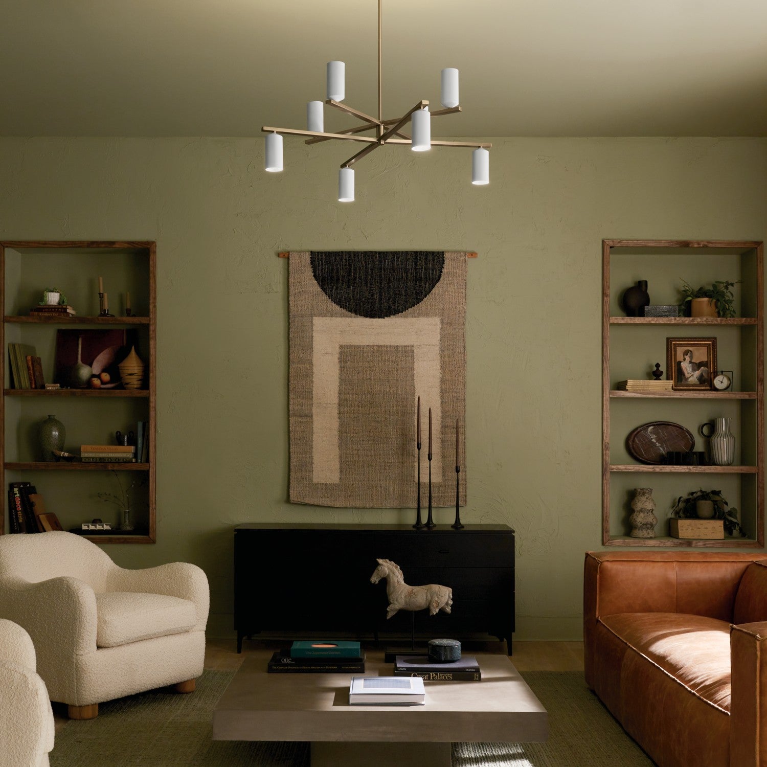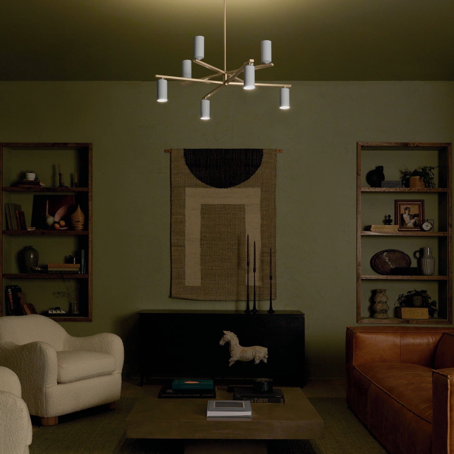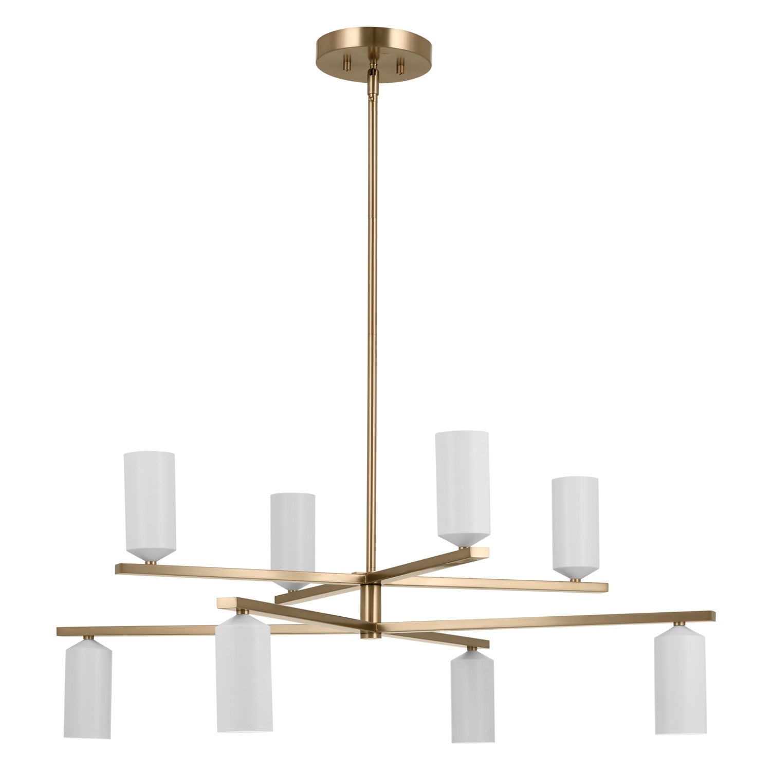 The Gala 8 light chandelier in champagne bronze with white has a modern design that commands attention. Its top and bottom clusters rotate independently of one another letting you choose your configuration. The top cluster faces up for indirect lighting that bounces down from the ceiling, while the bottom cluster faces down for direct, ambient lighting.