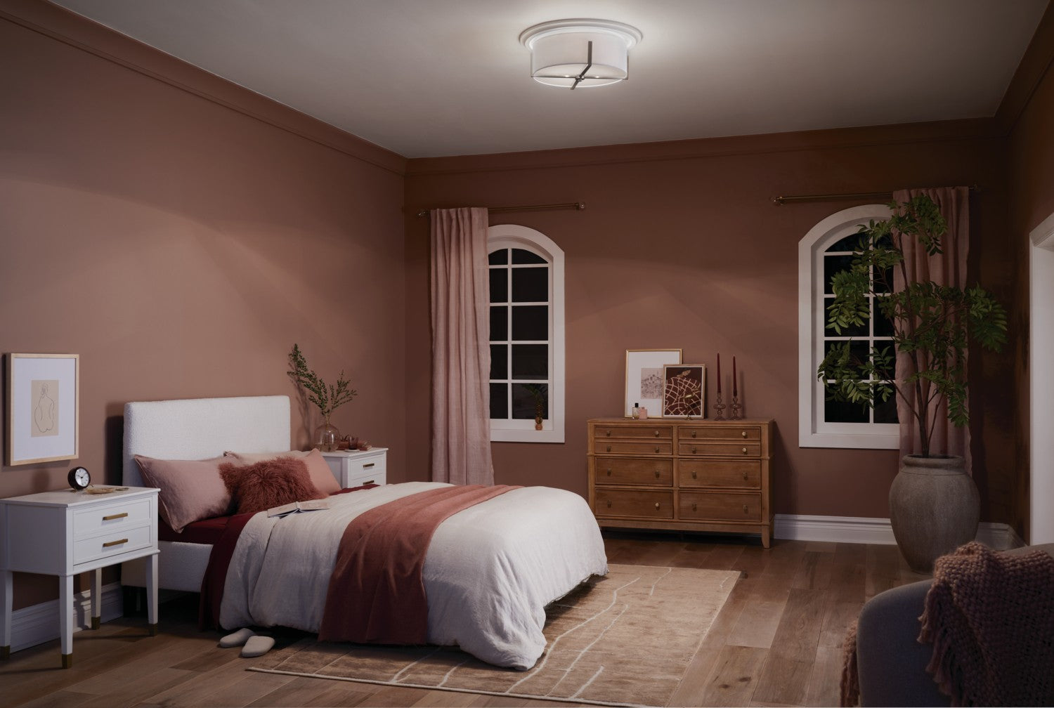 Inspired by the notion of holding and resting, the Malen flush mount is sheer elegance. Its fabric shade nestles into refined classic pewter metal uprights. Its satin etched white painted glass bottom softens the light as it illuminates your space.