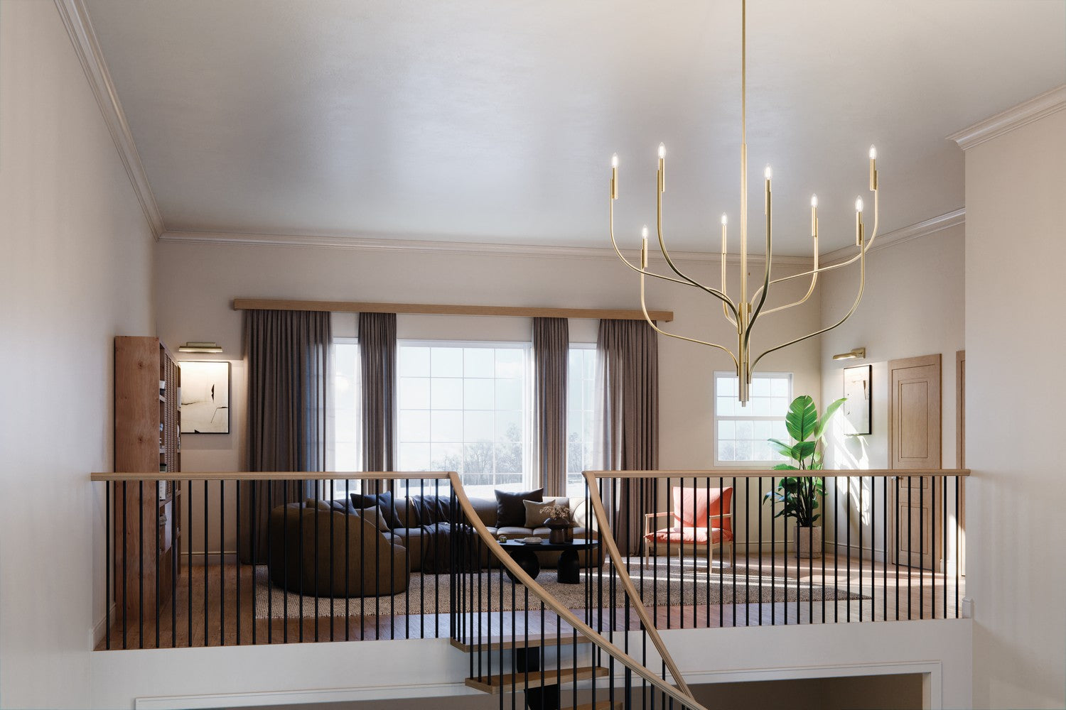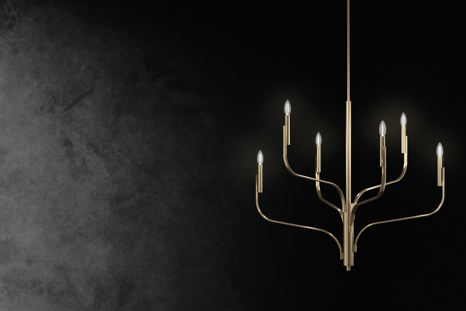 Inspired by the organic nature of branching plant formations, the Livadia chandelier breathes new life into the traditional. Its sculptural silhouette spirals upward, while its candlesticks pop at the top like budding flowers. Each arm reunites at the center column, resting on the body and creating a layered effect. This subtle asymmetric design dynamically changes as you move throughout the room, giving you and your guests a different perspective, no matter the location.