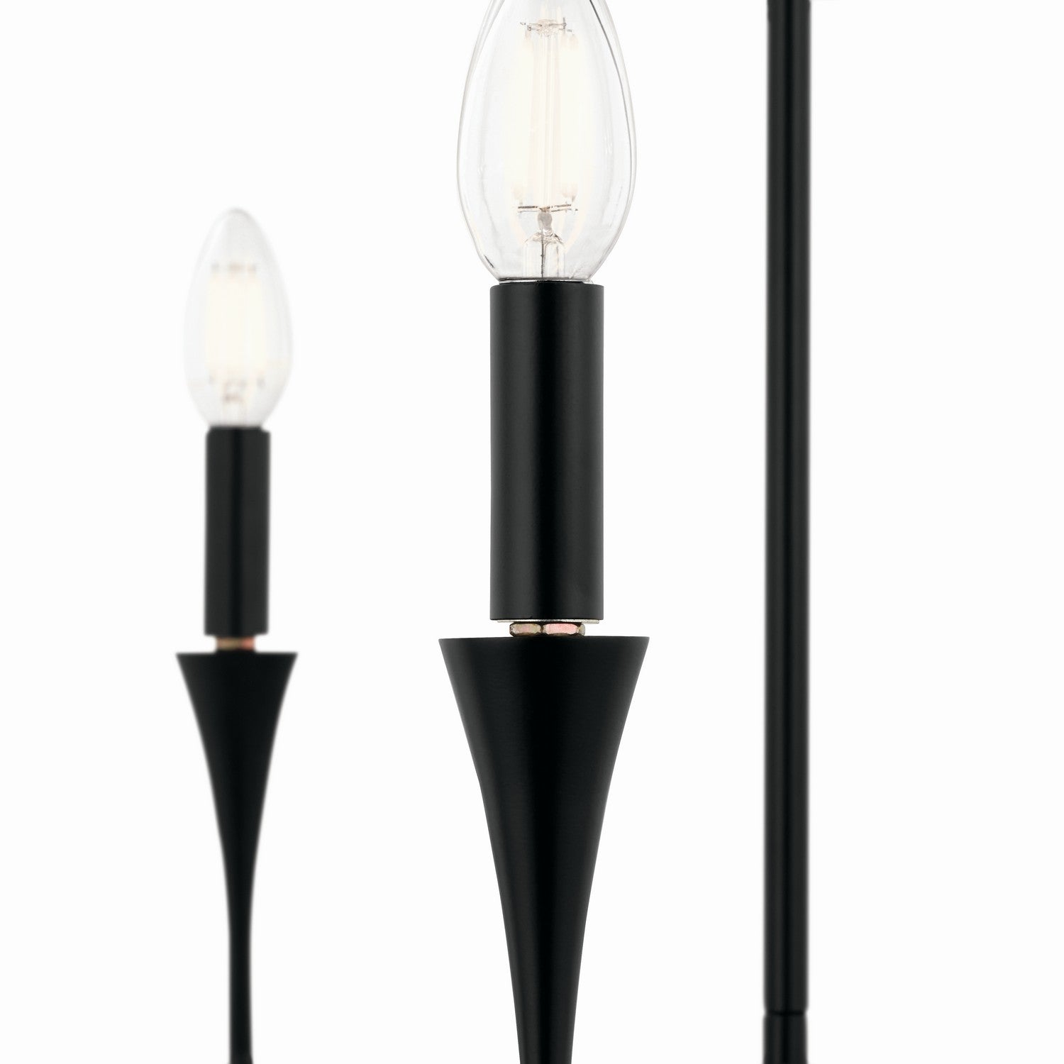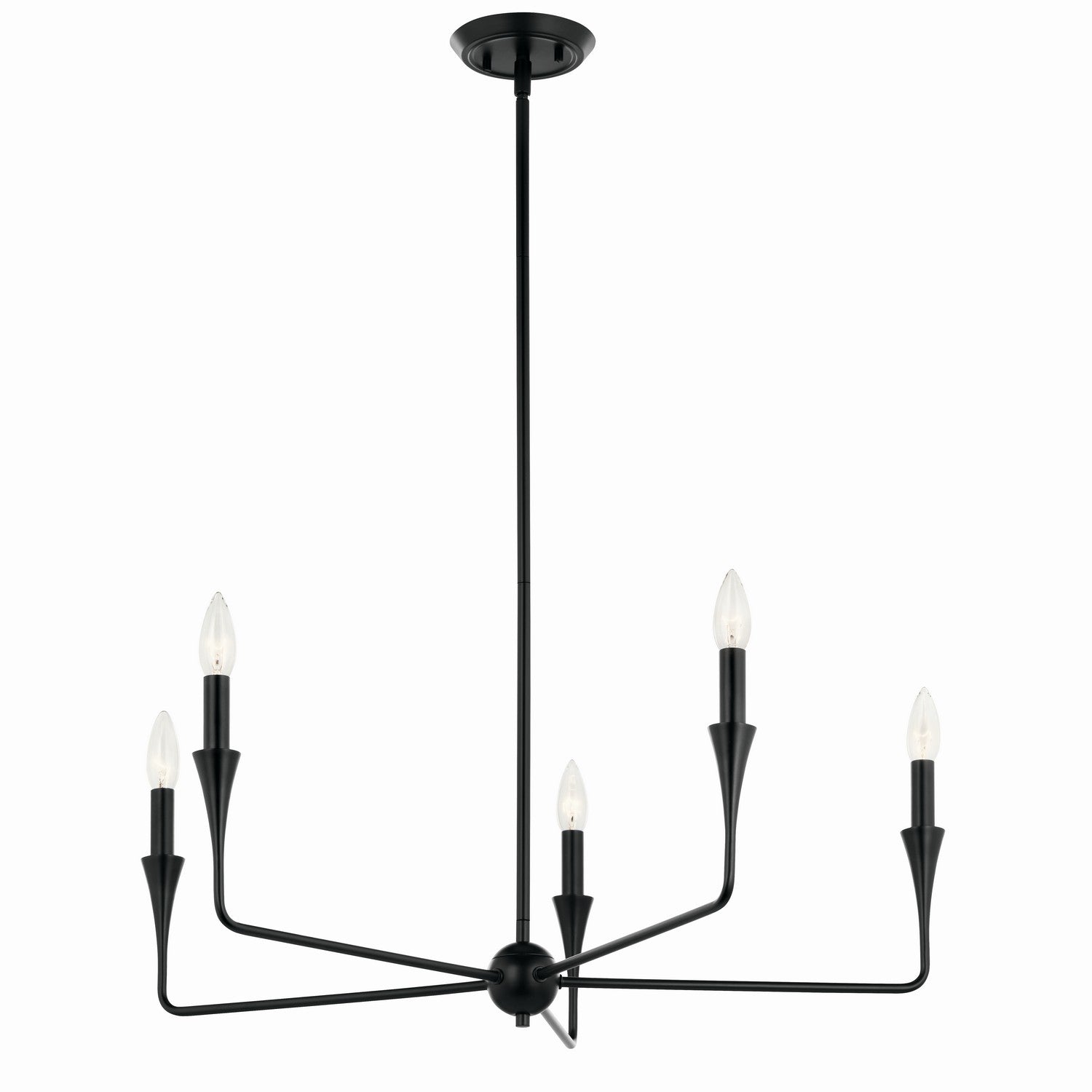 The Alvaro 30 Inch 5 Light chandelier in black features a simple silhouette and unique tapered accent. Designed with 90-degree angles, Alvaro starts at the canopy and floats down to the center root of the fixture, gliding outward and upward with a bloom of light at the end. This fixture also features bobeche on each arm â€" flaring out into the candlestick for a soft modern look.