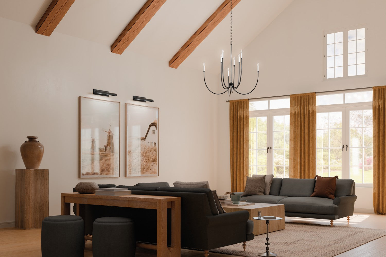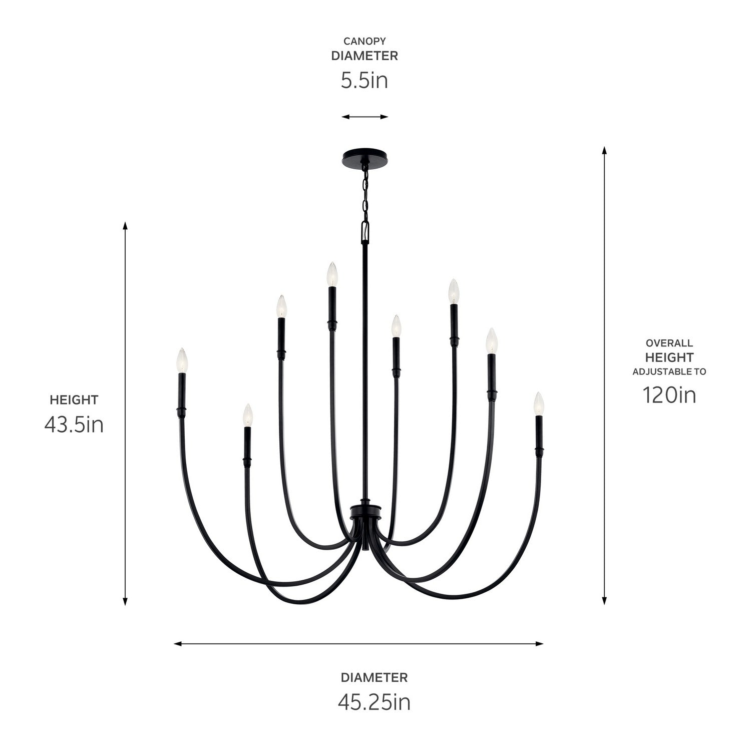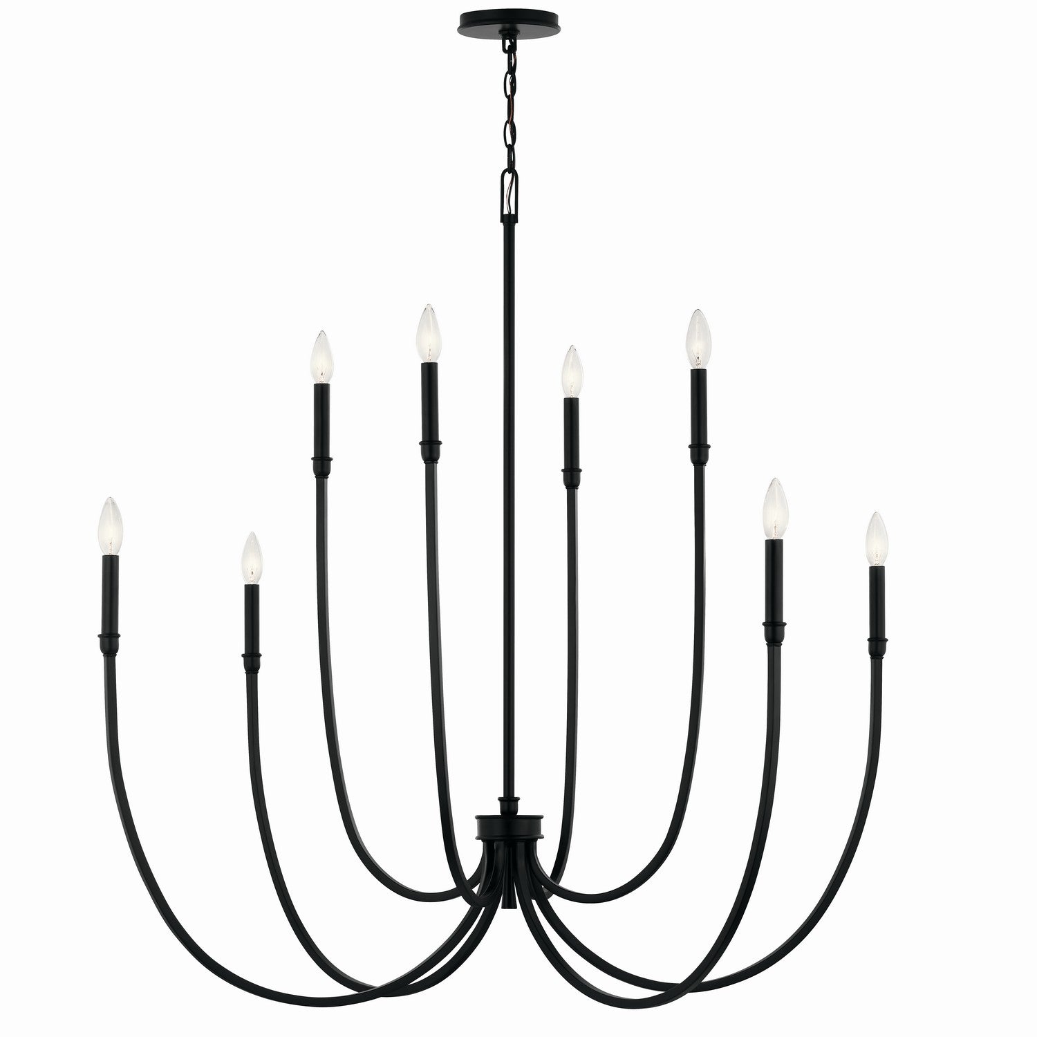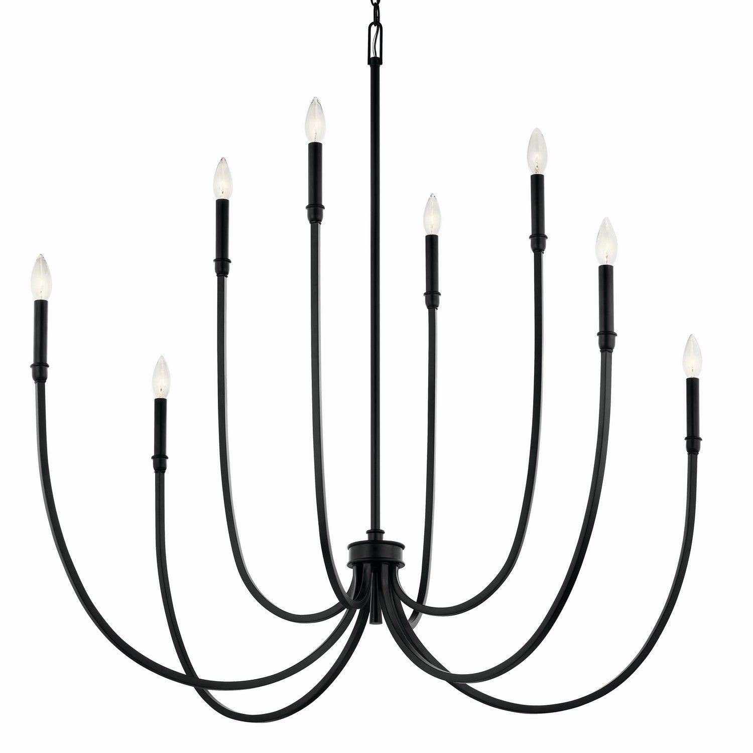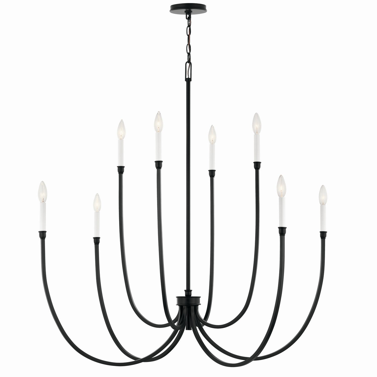 The Malene foyer chandelier is inspired by the graceful movement of rippling waterâ€"gentle, flowing, and captivating. These characteristics come to life in its soft, sweeping arms and elegant, stacked details. Includes two different candle sleeves, white for a contrasting, traditional look or black for a modern look.