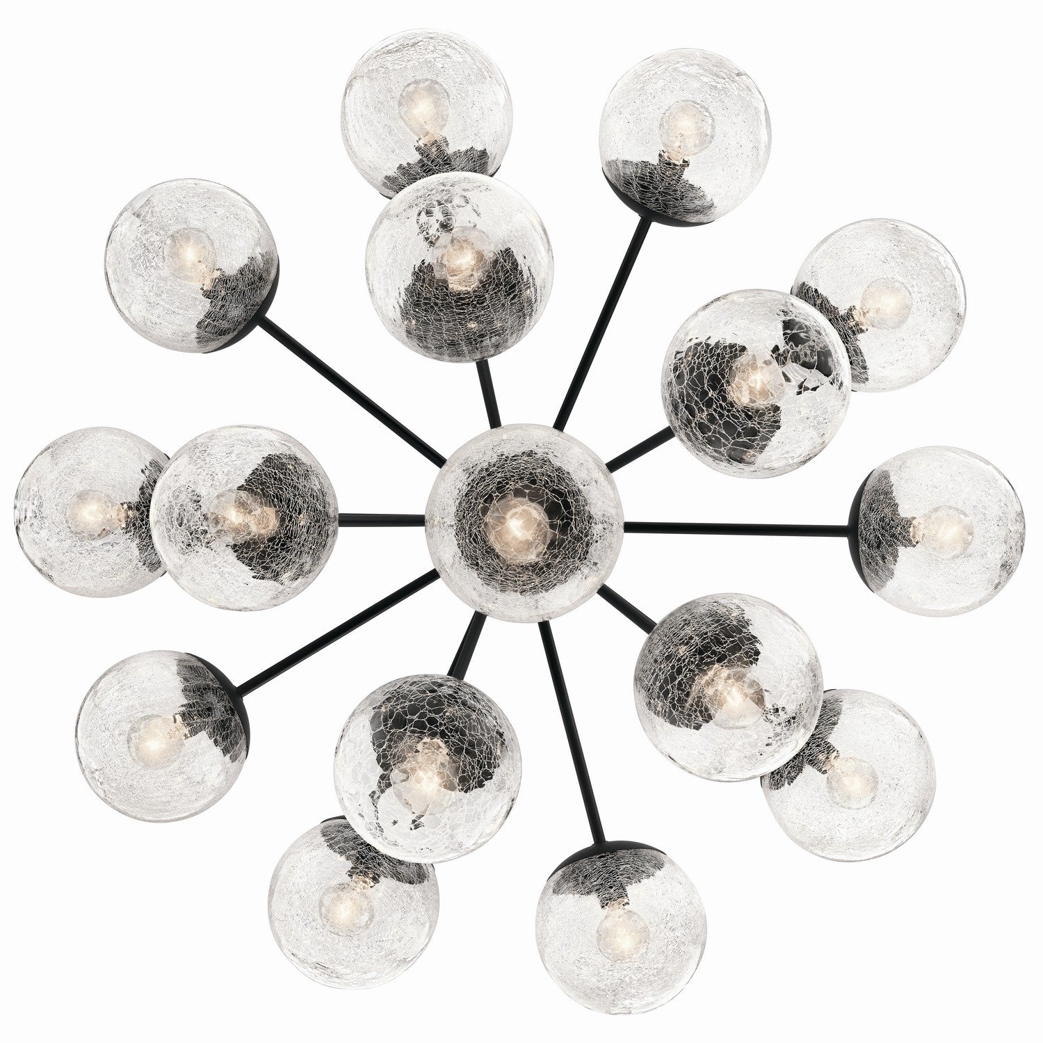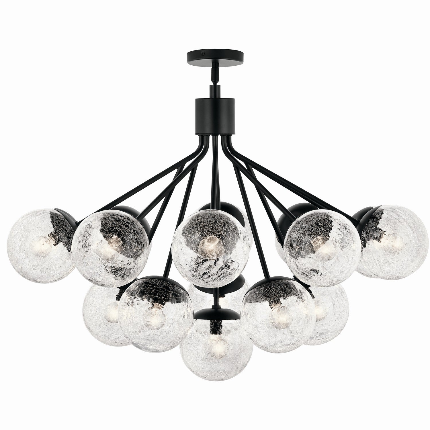 Inspired by frozen grapes, the Silvarious convertible chandelier will capture the hearts of family and friends. Gathered at the center, its arms branch out with sparkling globes at the end, for a simple, yet playful design. Its crackled glass provides unique light play against its black finish. Install as a semi flush mount or pendant. As a semi-flush, the glass will deliver a beautiful light effect on the ceiling and walls.